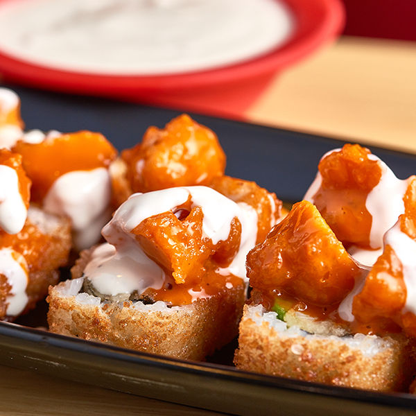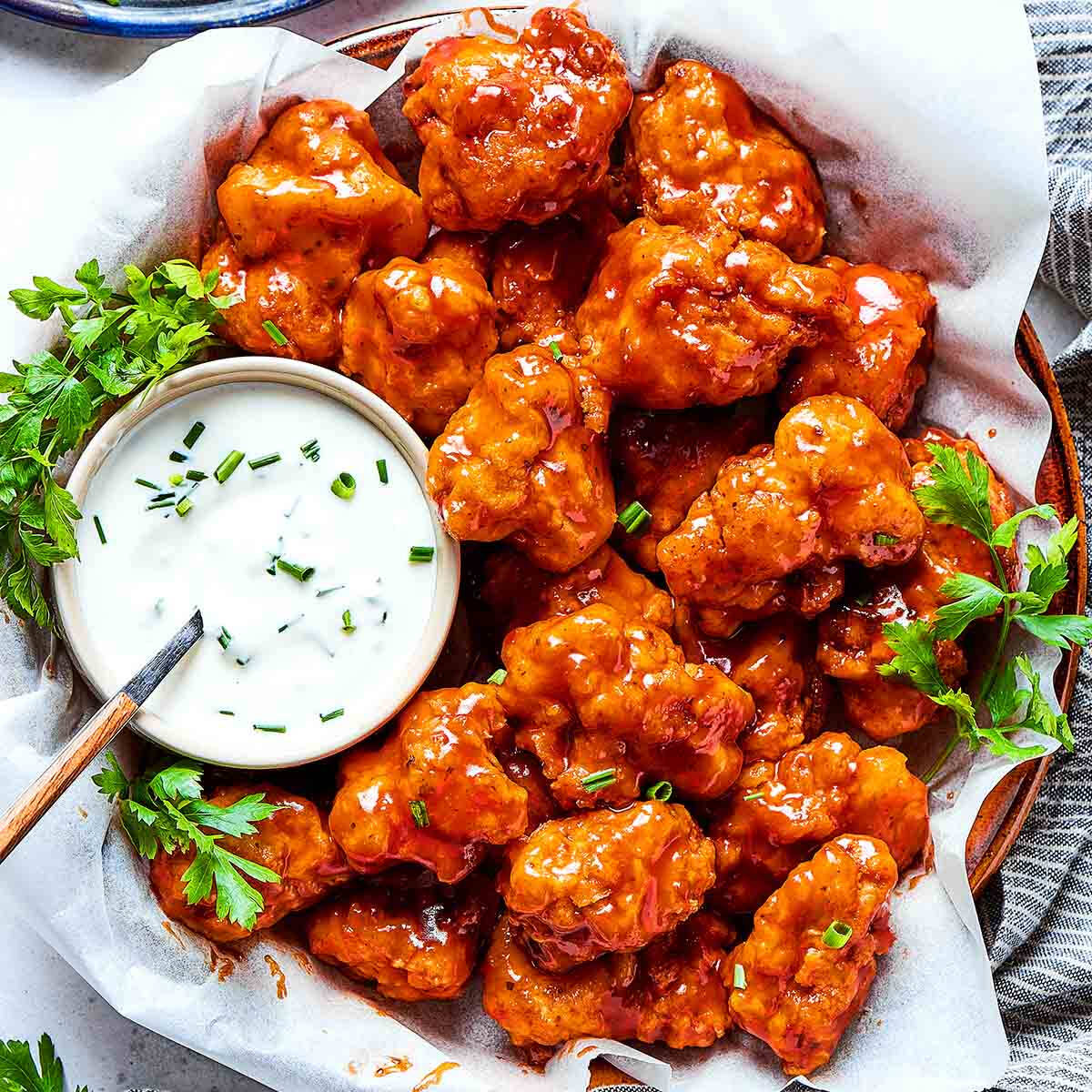 Trozos de pollo empanizado, bañados en salsa BBQ o búfalo, acompañados de aderezos.