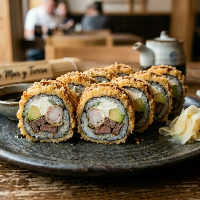 Camarón, res, philadelphia y pepino, arriba queso gratinado con camarones empanizados y tocino.