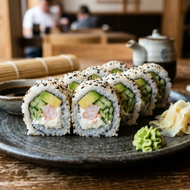 Philadelphia, aguacate, pepino y camarón empanizado forrado de Philadelphia con tampico