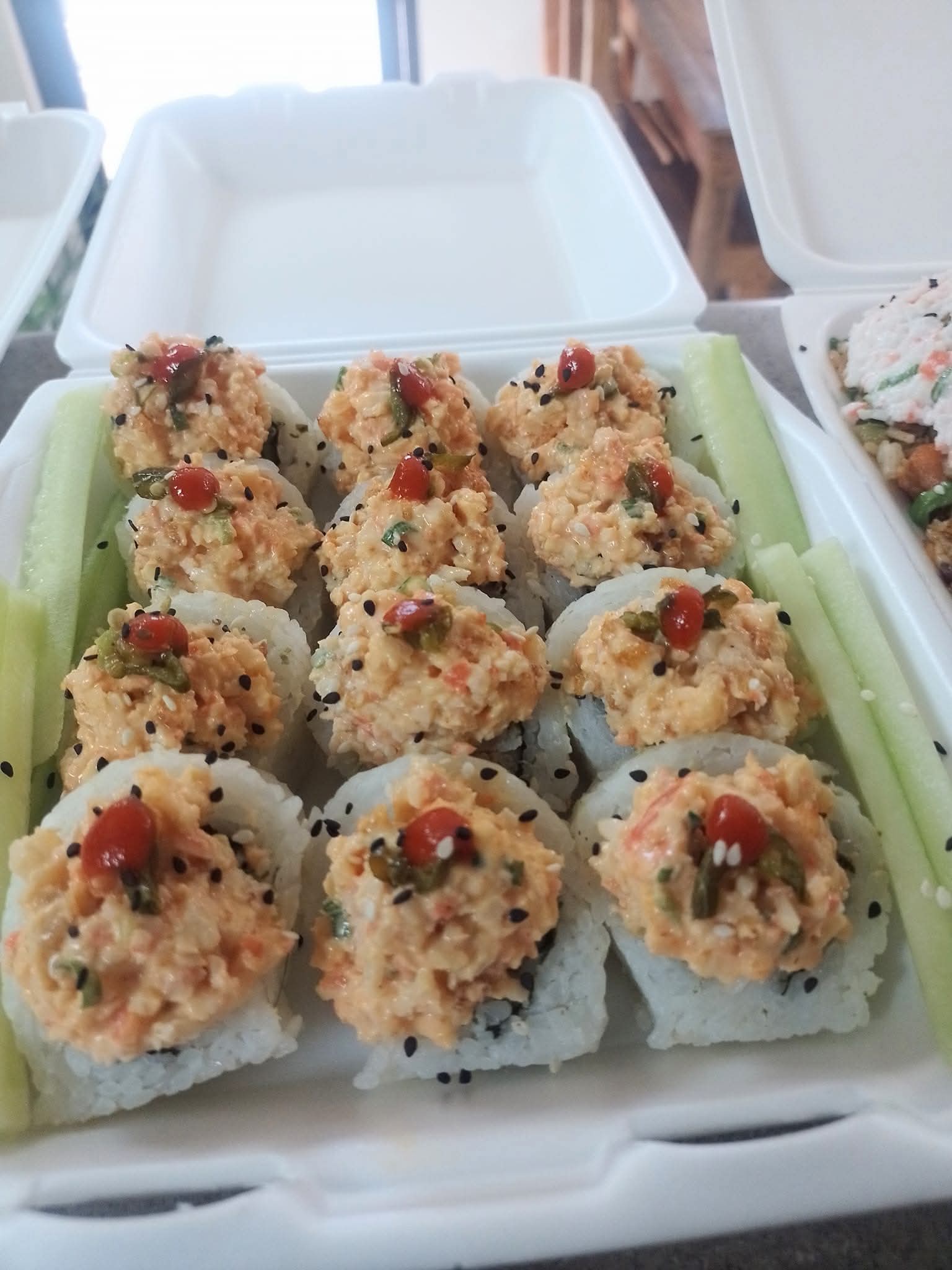 Base de california, con un topping de surimi y camarón empanizado y chile serrano.