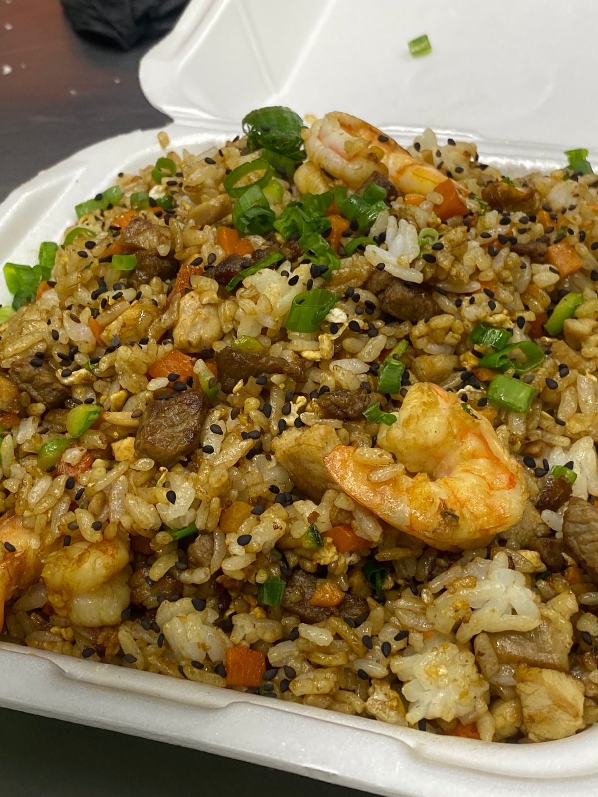 Arroz blanco, pollo, carne, camarón, morrón y cebolla, bañado en salsa teriyaki.