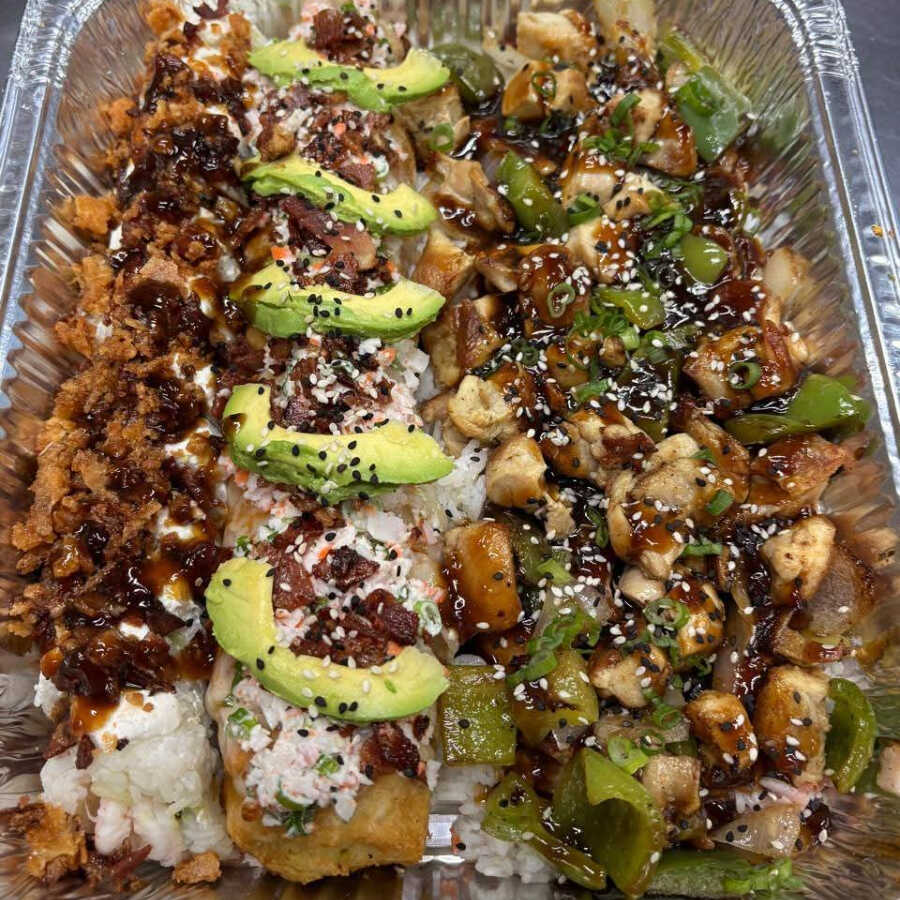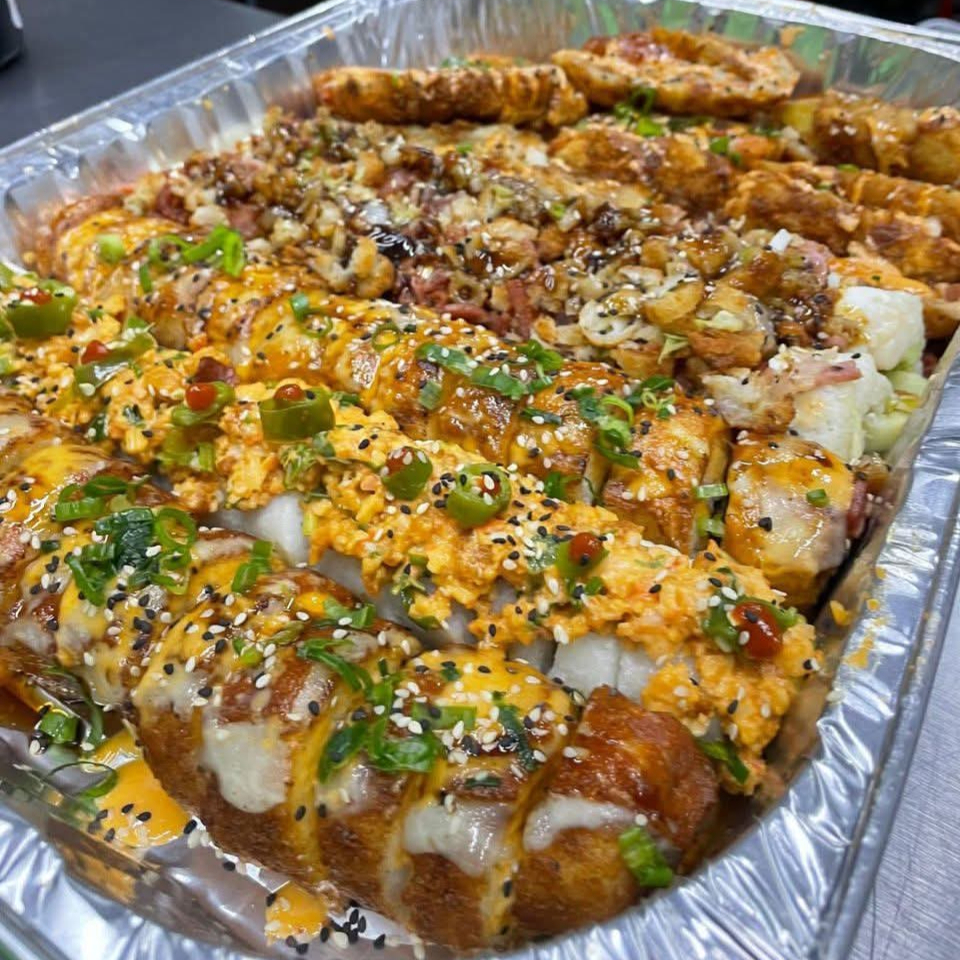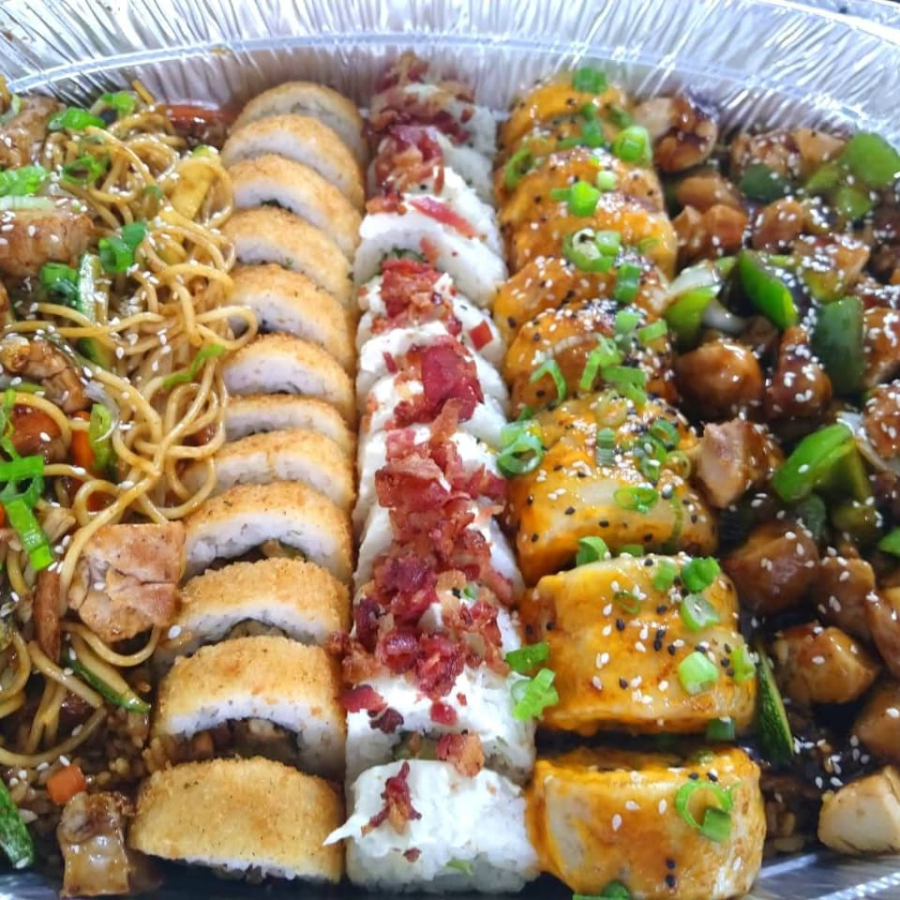 Charola para 5-6 personas aprox. contiene pasta yakisoba, 1 rollo cielo, mar y tierra, 1 rollo kibo roll, 1 rollo llamas roll, y teriyaki de pollo.