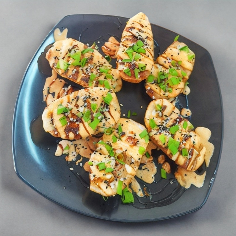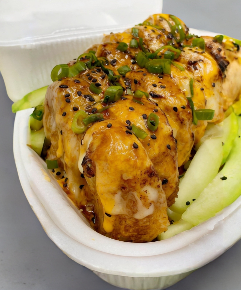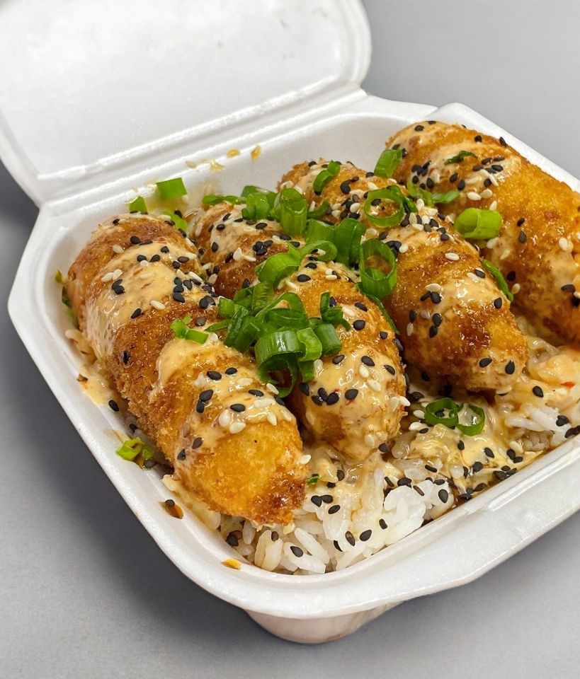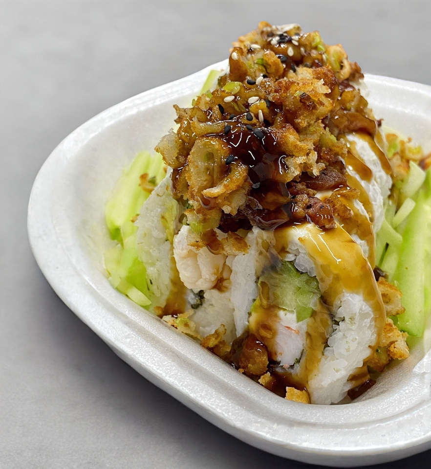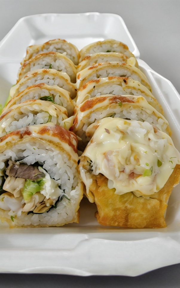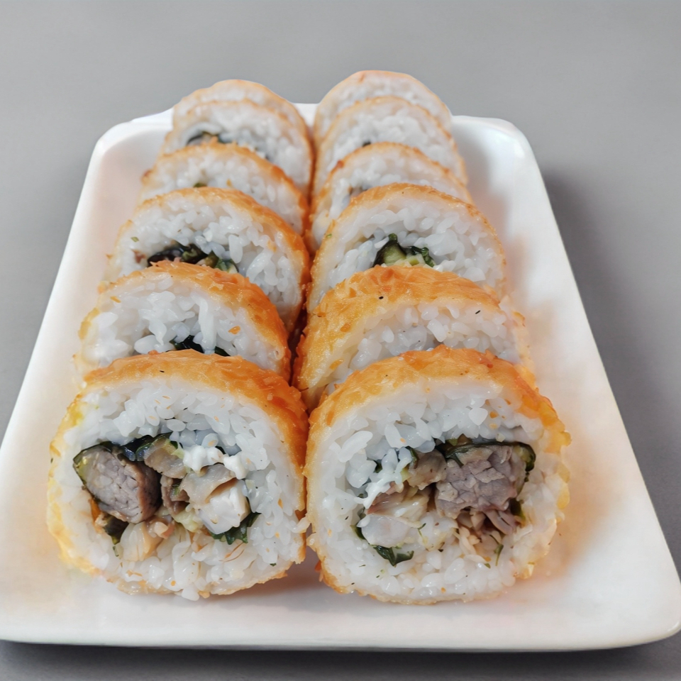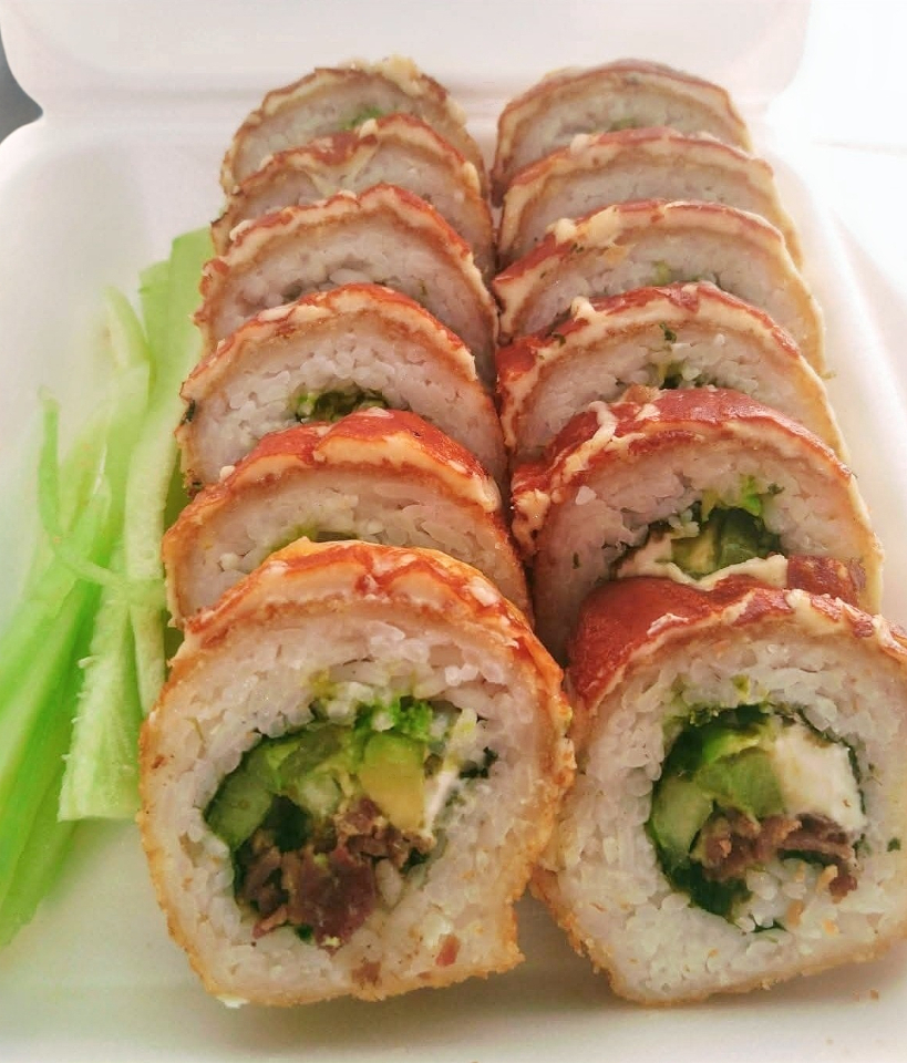 Camarón empanizado, aguacate, pepino, queso crema, forrado con queso crema, tocino, trozos de aros de cebolla y salsa teriyaki.