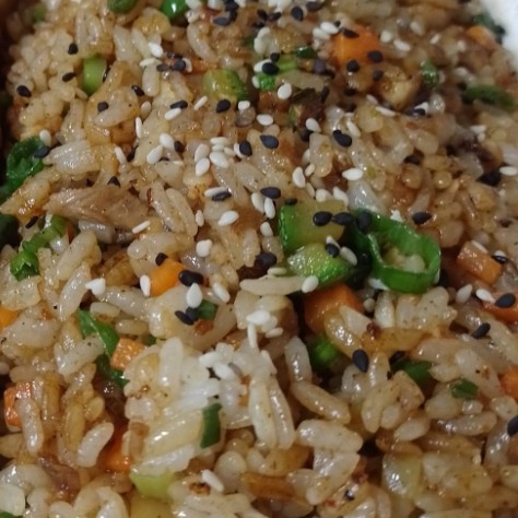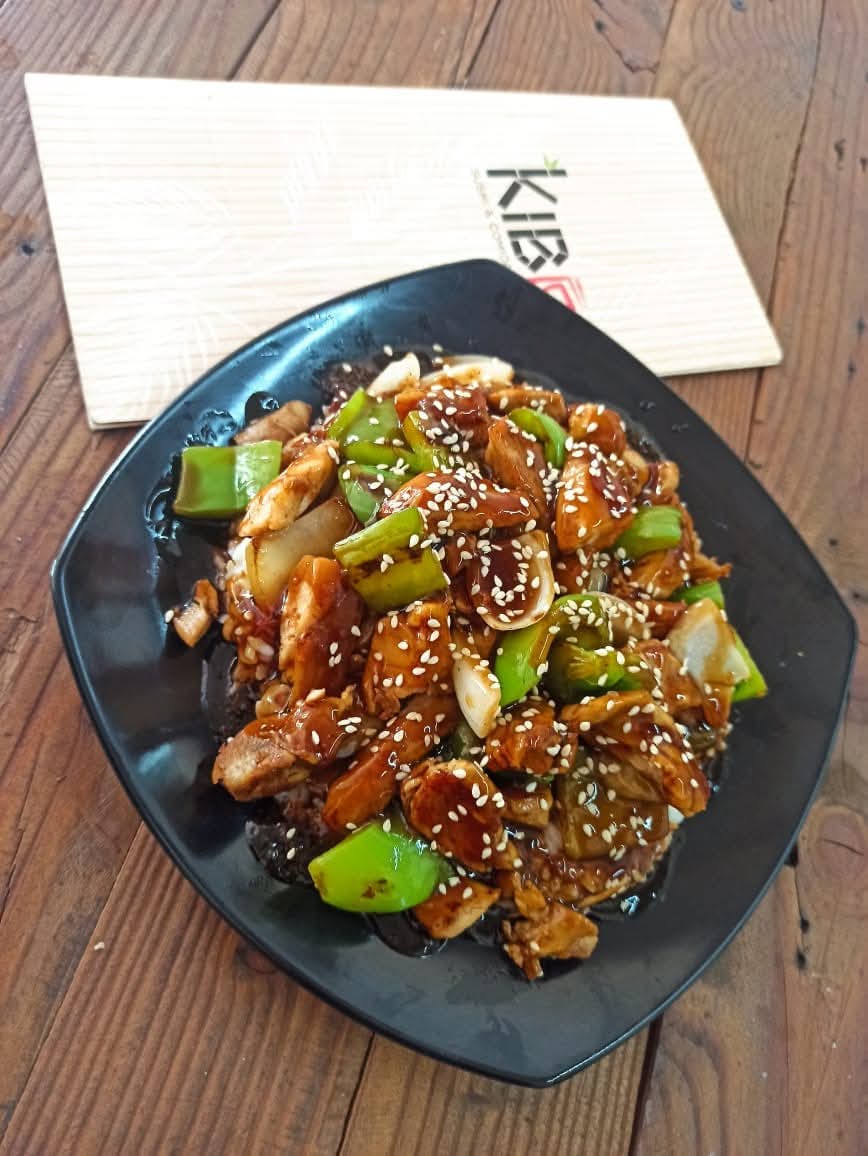 Arroz blanco, pollo, morrón y cebolla, bañado en salsa teriyaki.