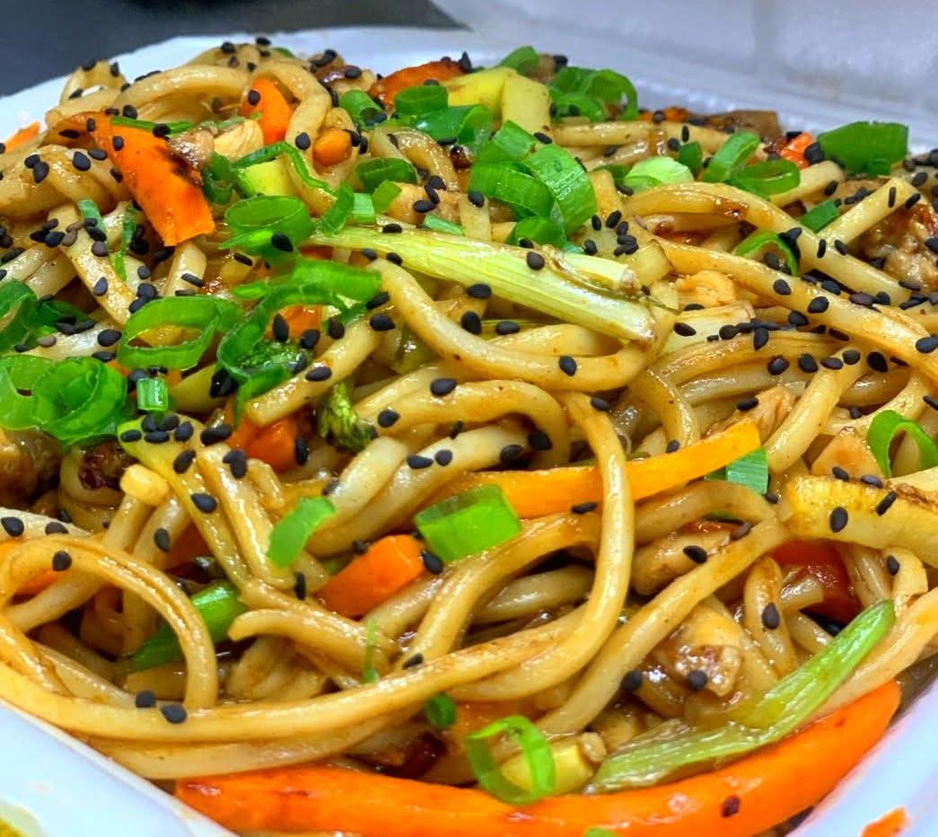 Arroz blanco, pollo, verduras salteadas y pasta, bañado en pasta yakisoba.