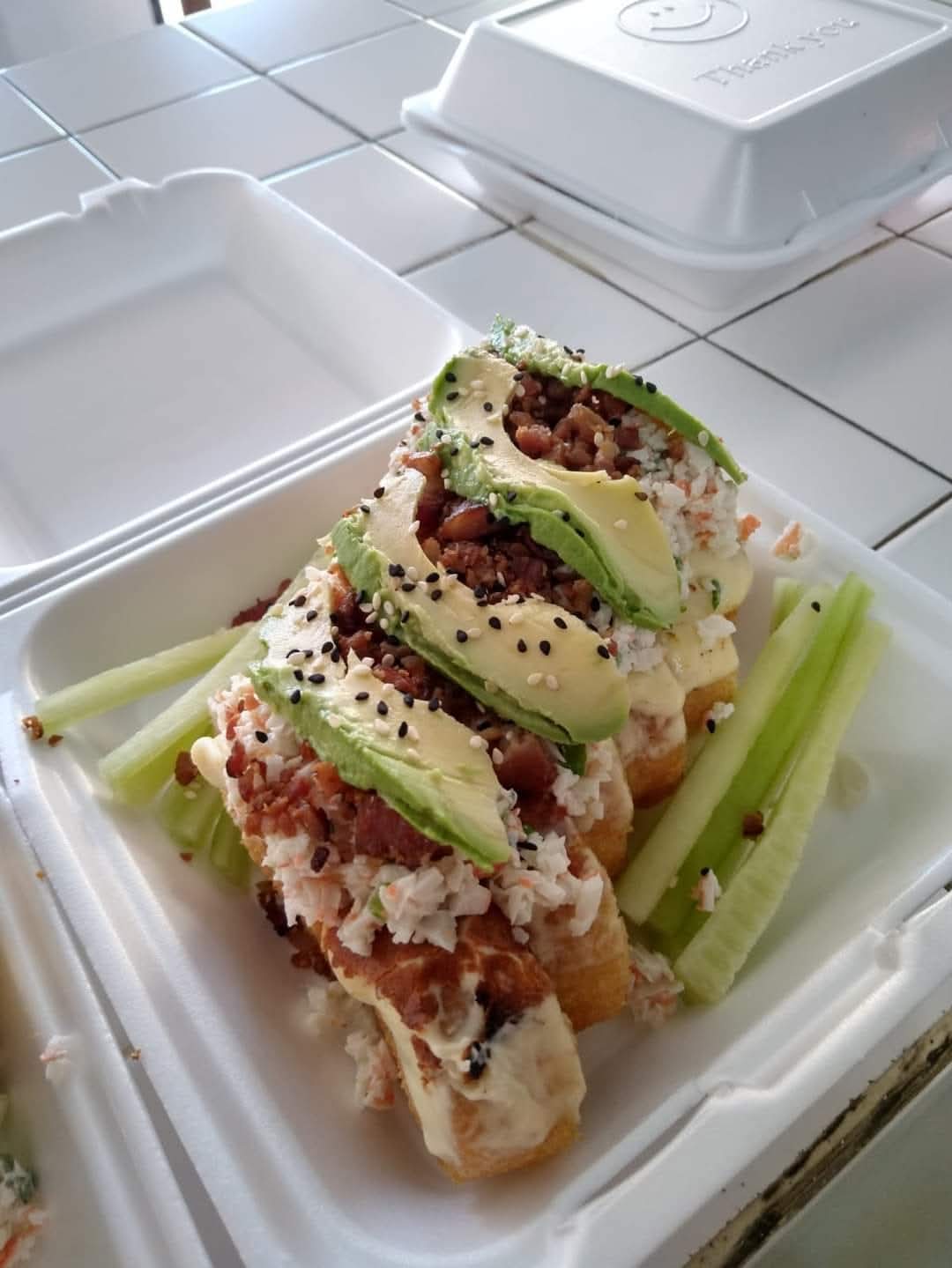 Camarón, aguacate, pepino, queso crema, empanizado, forrado con costra de queso, tampico, tocino y aguacate.