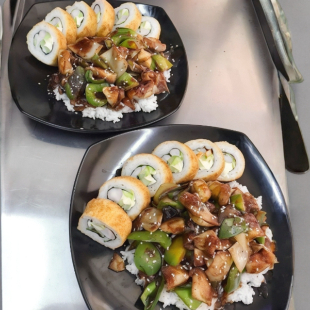 Rollo fusión y medio teriyaki o yakimeshi, incluye té de la casa.