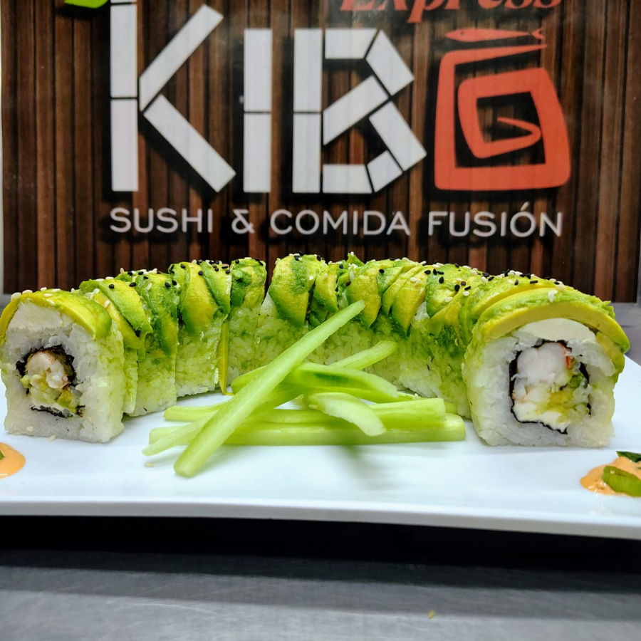 Camarón o surimi, aguacate, pepino, queso, crema forrado de aguacate.