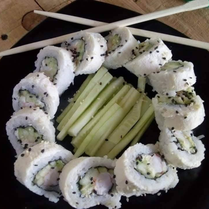 Charola para 4 personas aprox. contiene 1 rollo Nami Roll, 1 rollo kibo roll y Teriyaki.