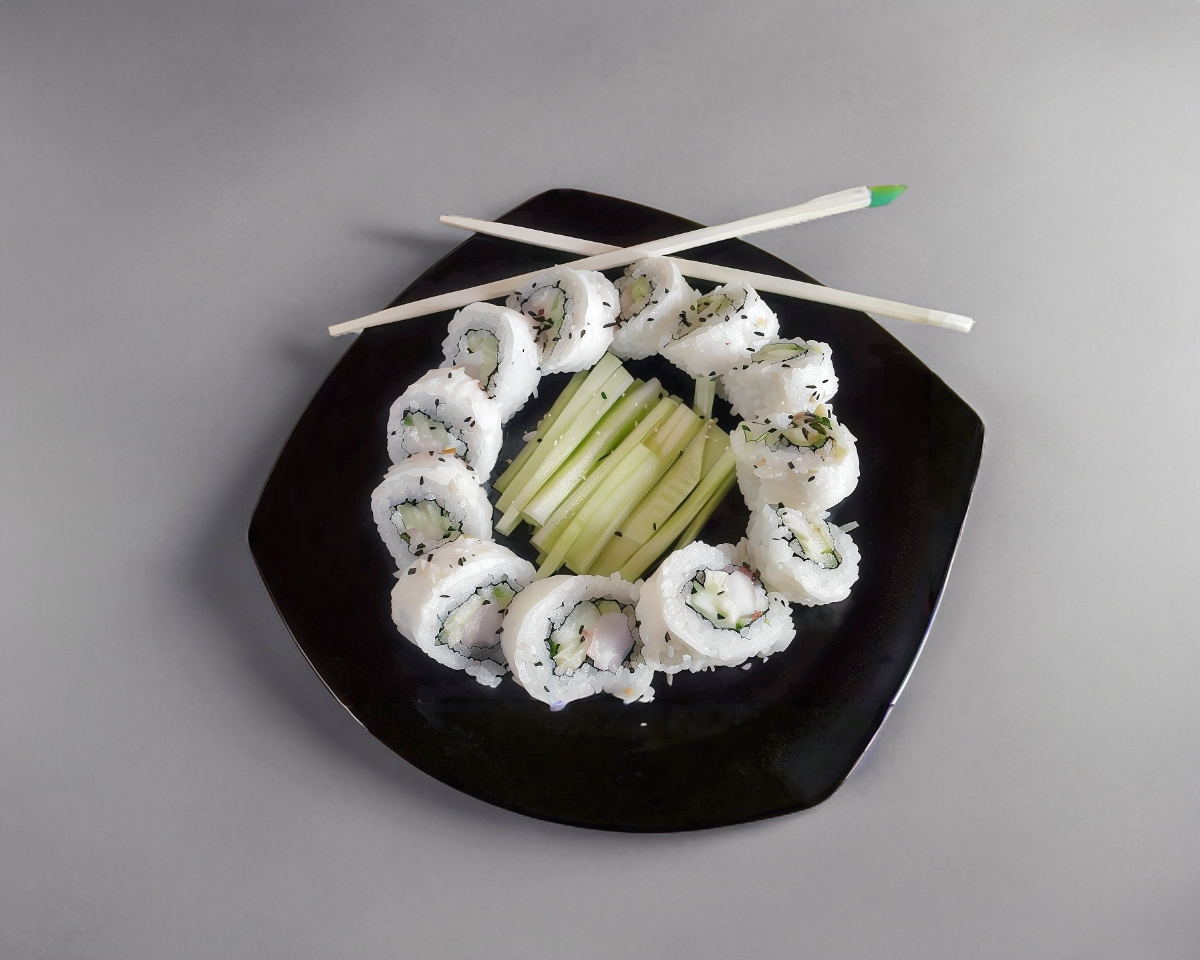 Camarón o surimi, aguacate, pepino y queso crema, forrado de queso crema.