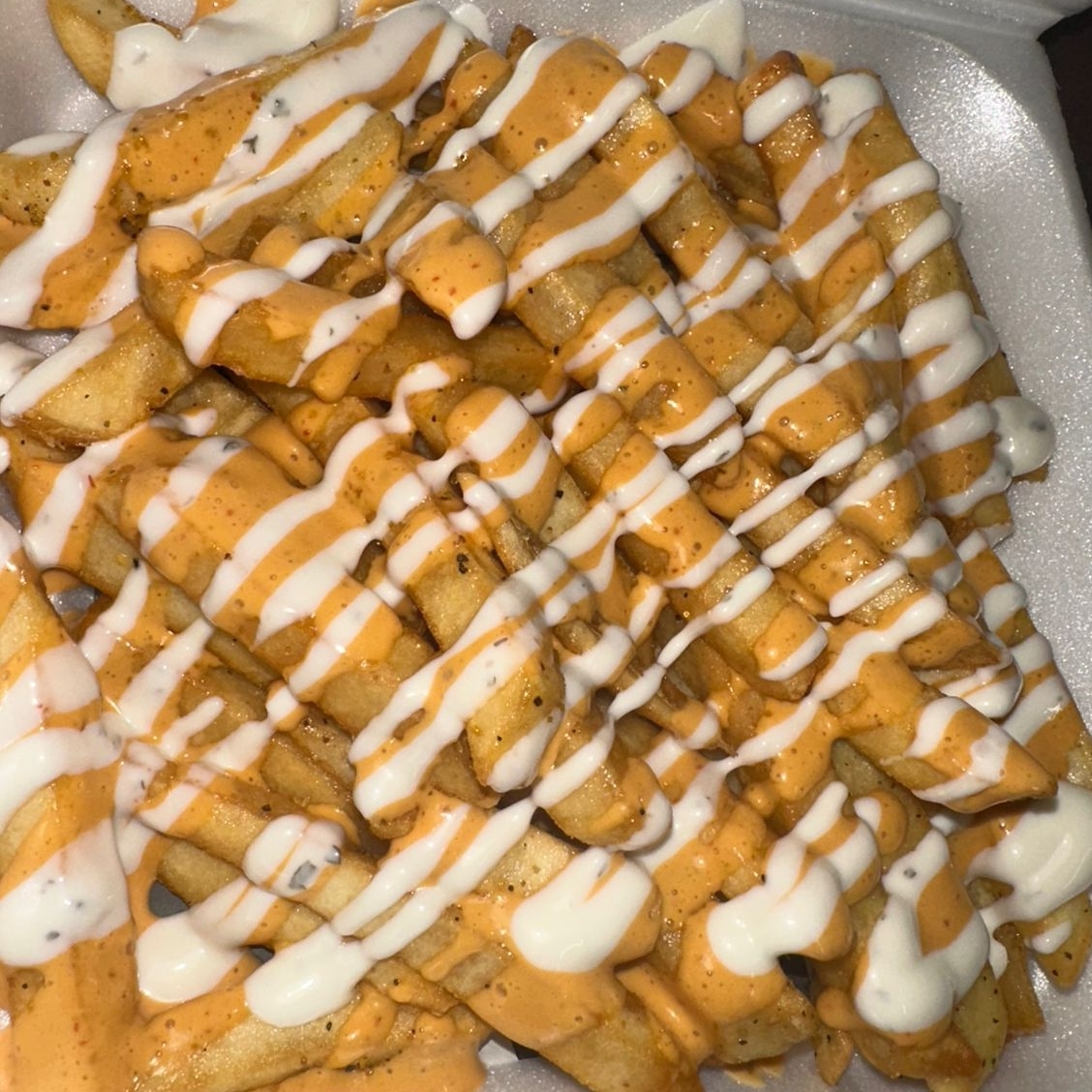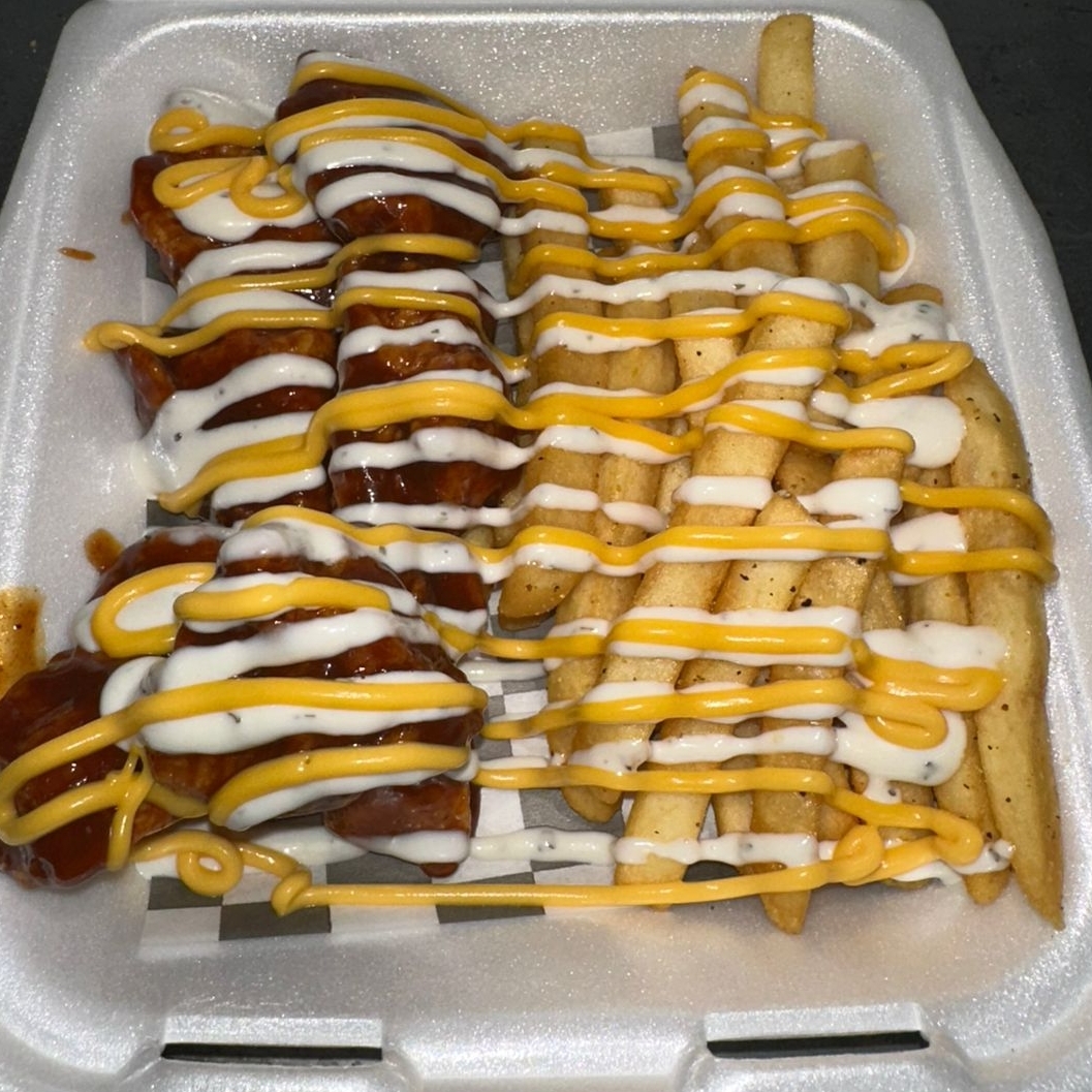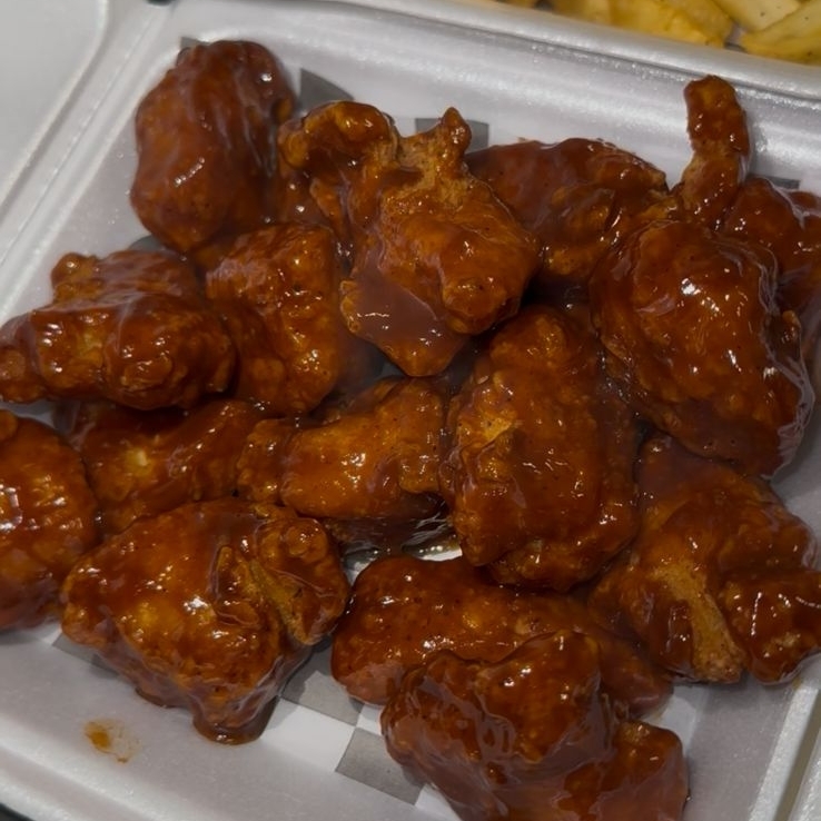 Cono de papas a la francesa servido con 7 piezas de jugosos boneless en la parte superior.