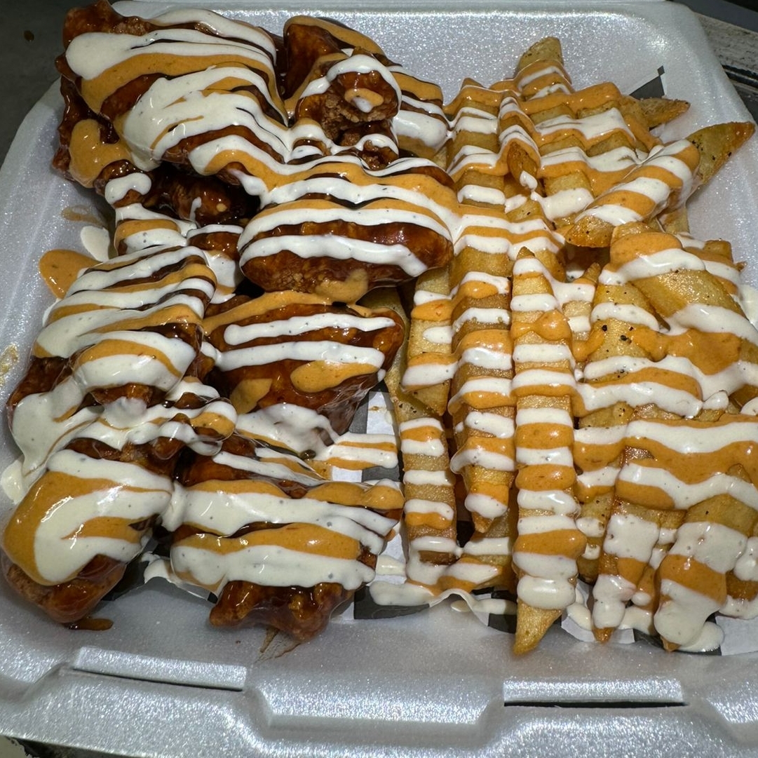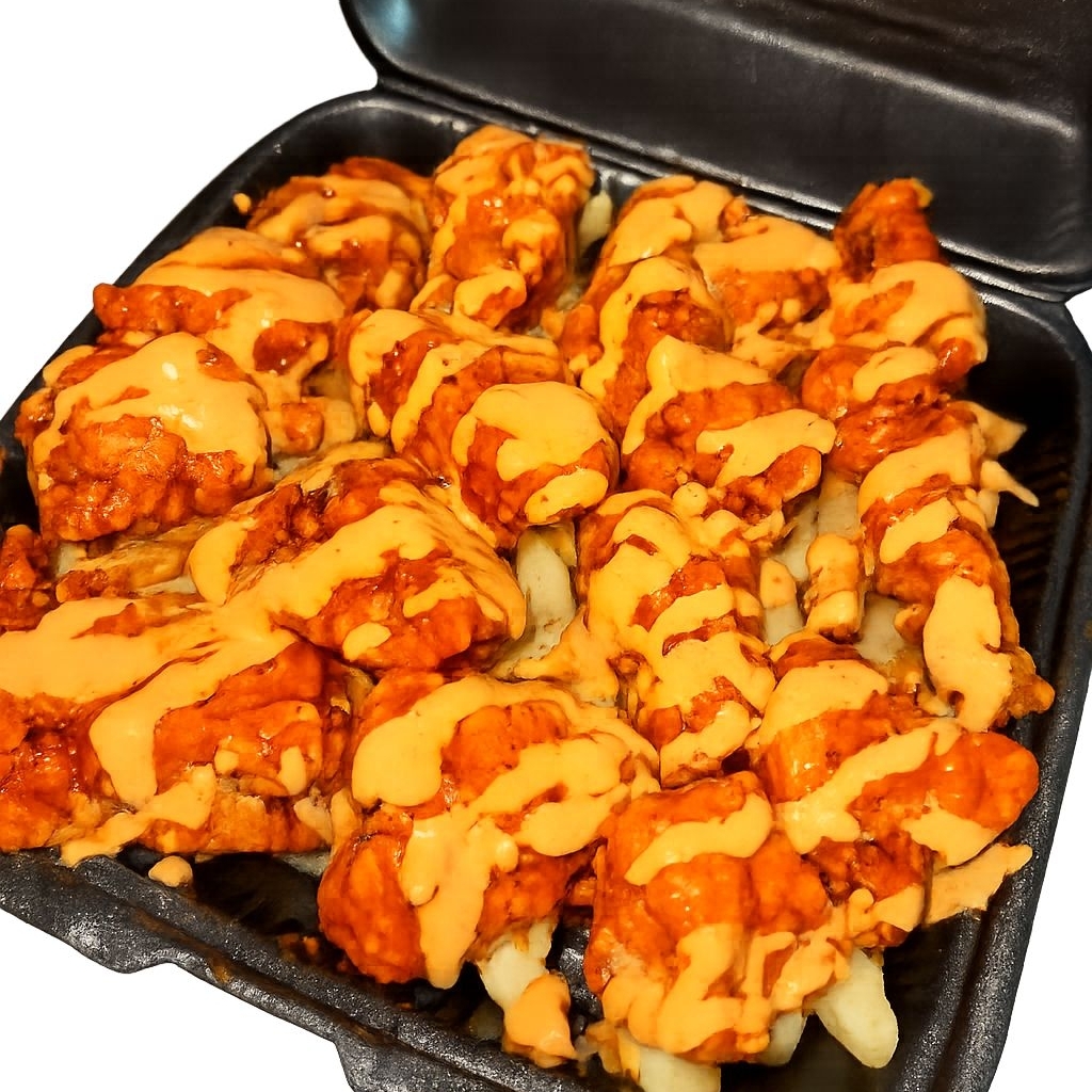 La experiencia completa: una base de papas, una capa de boneless, más papas en medio y coronado con boneless (11 piezas en total).
