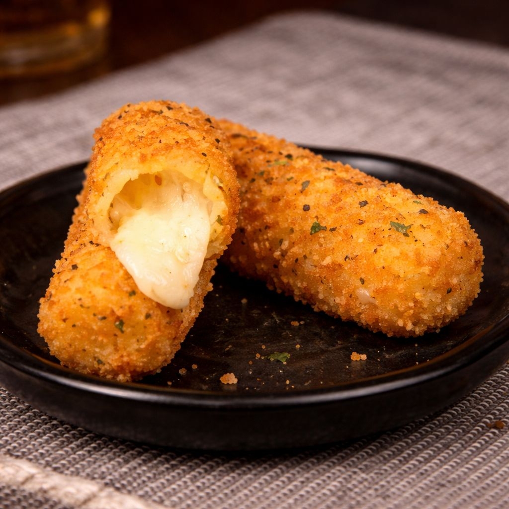 Dos piezas de dedos de queso mozzarella empanizados y fritos.