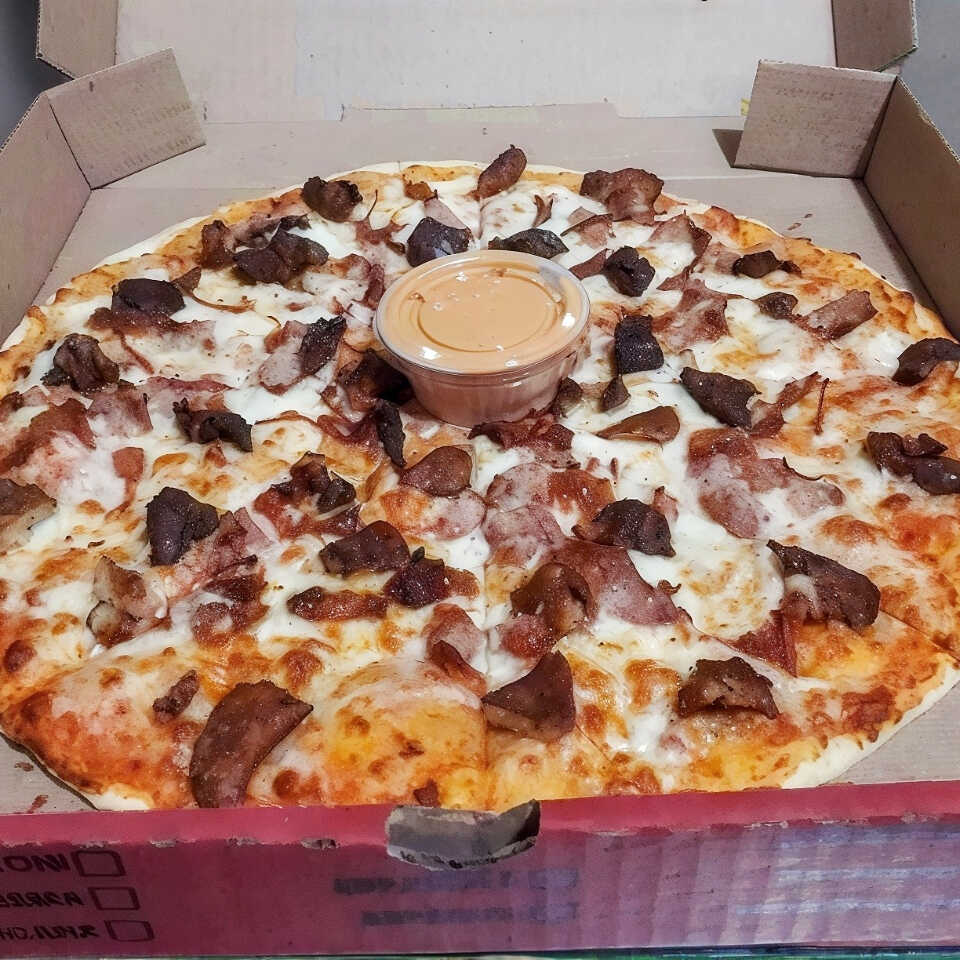 Por dentro Pechuga de pollo,tocino,jamon,pepperoni,queso mozzarella chipotle y por fuera queso mozzarella y pepperoni