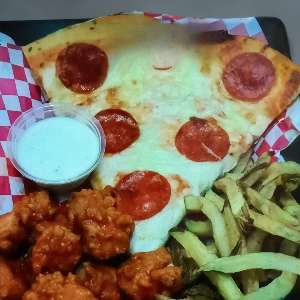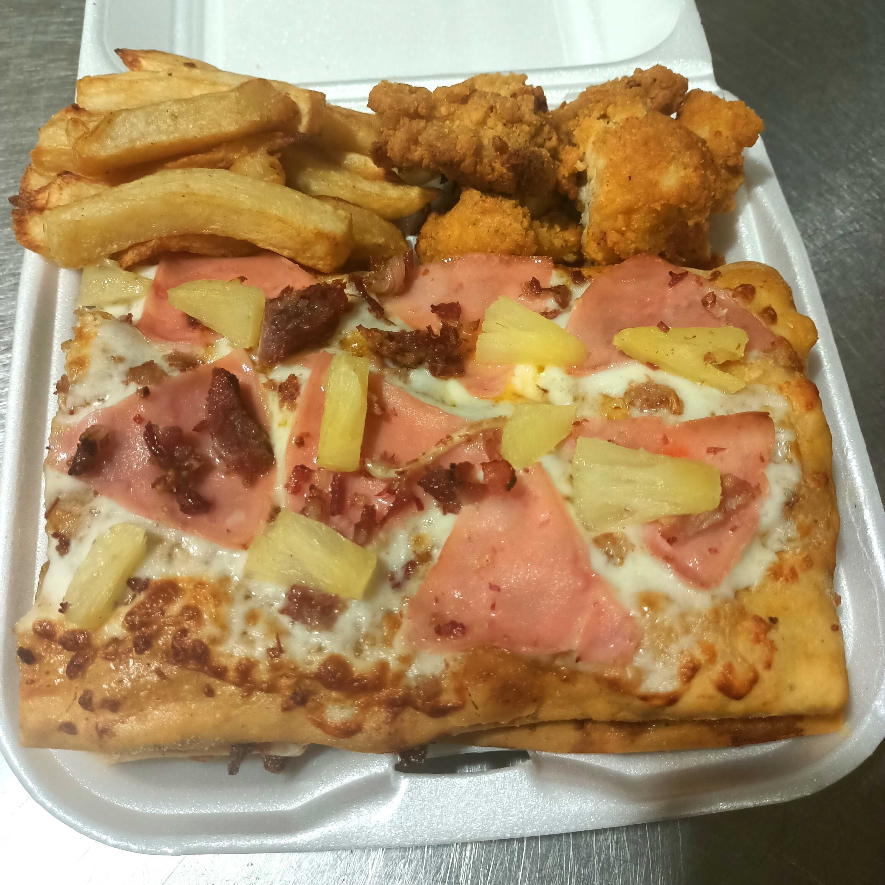 Rebanada grande de pizza +papas+boneless+bebida
