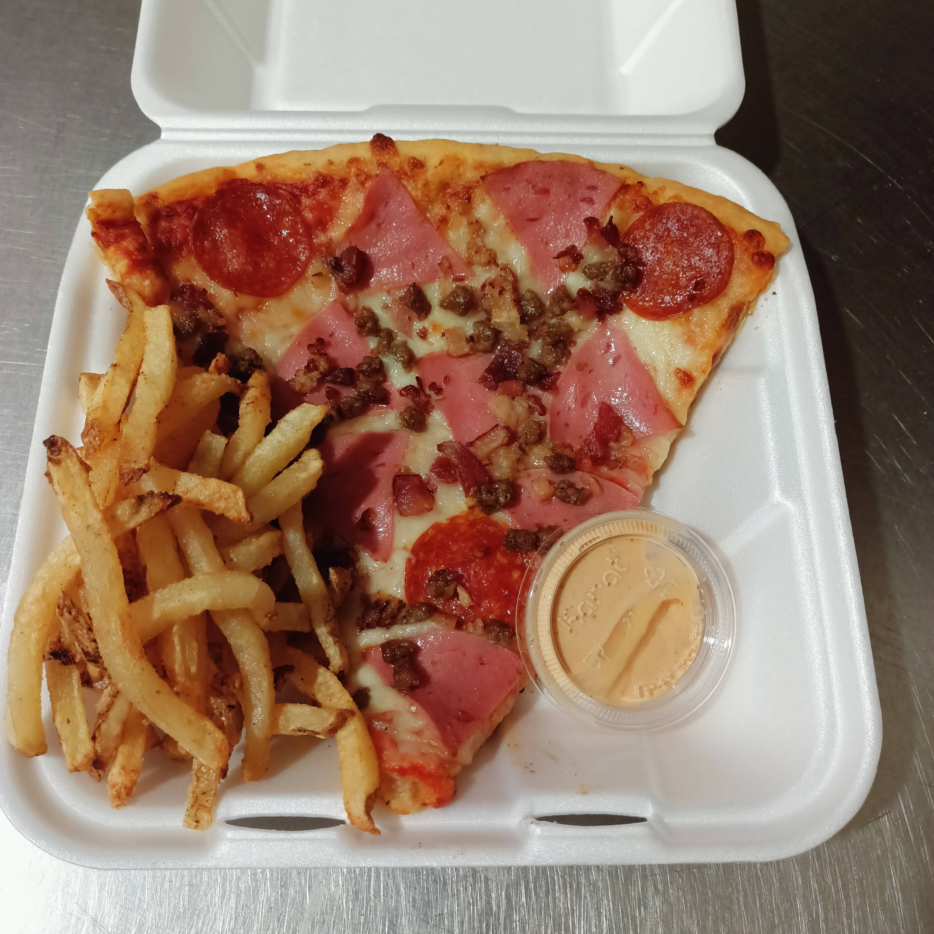 Rebanada grande de pizza acompañada de papas fritas y un aderezo chipotle
