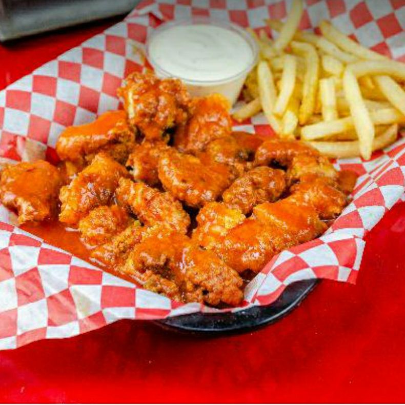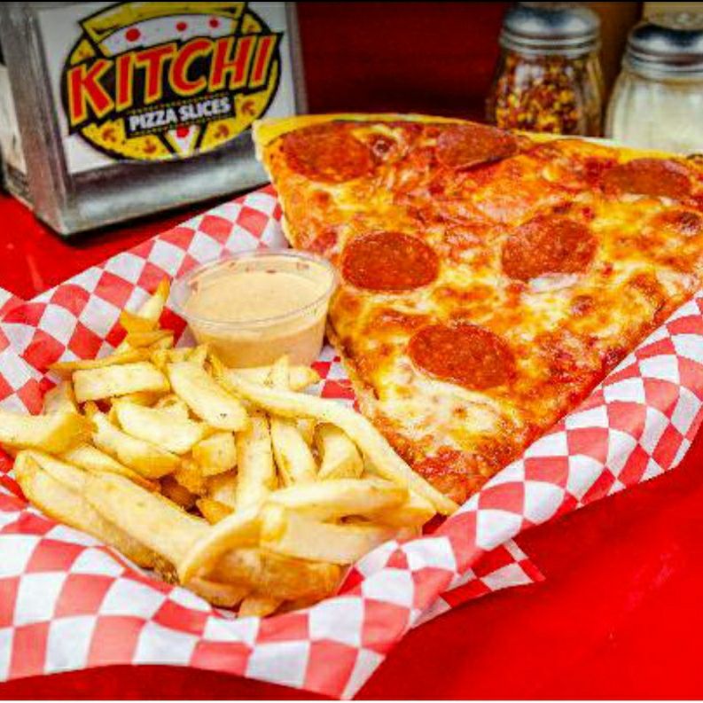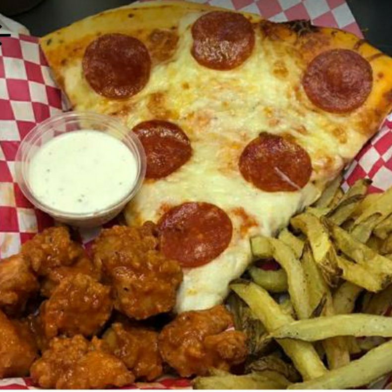 Rebanada de pizza de tu elección, con papas fritas y bonneles bañados en salsa Buffalo o bbq.
