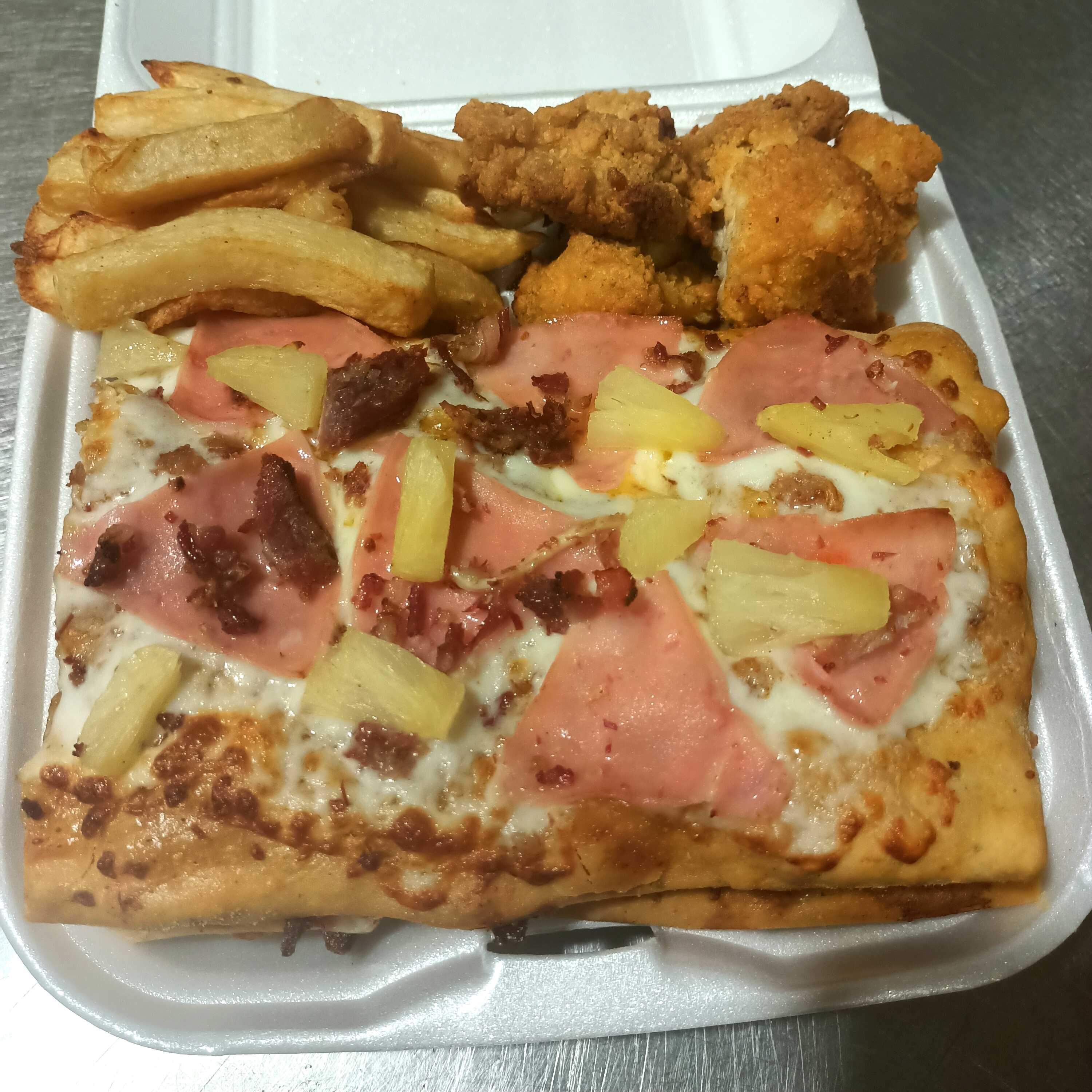 Salsa, queso mozzarella, jamon, tocino y piña de 8 rebanadas.