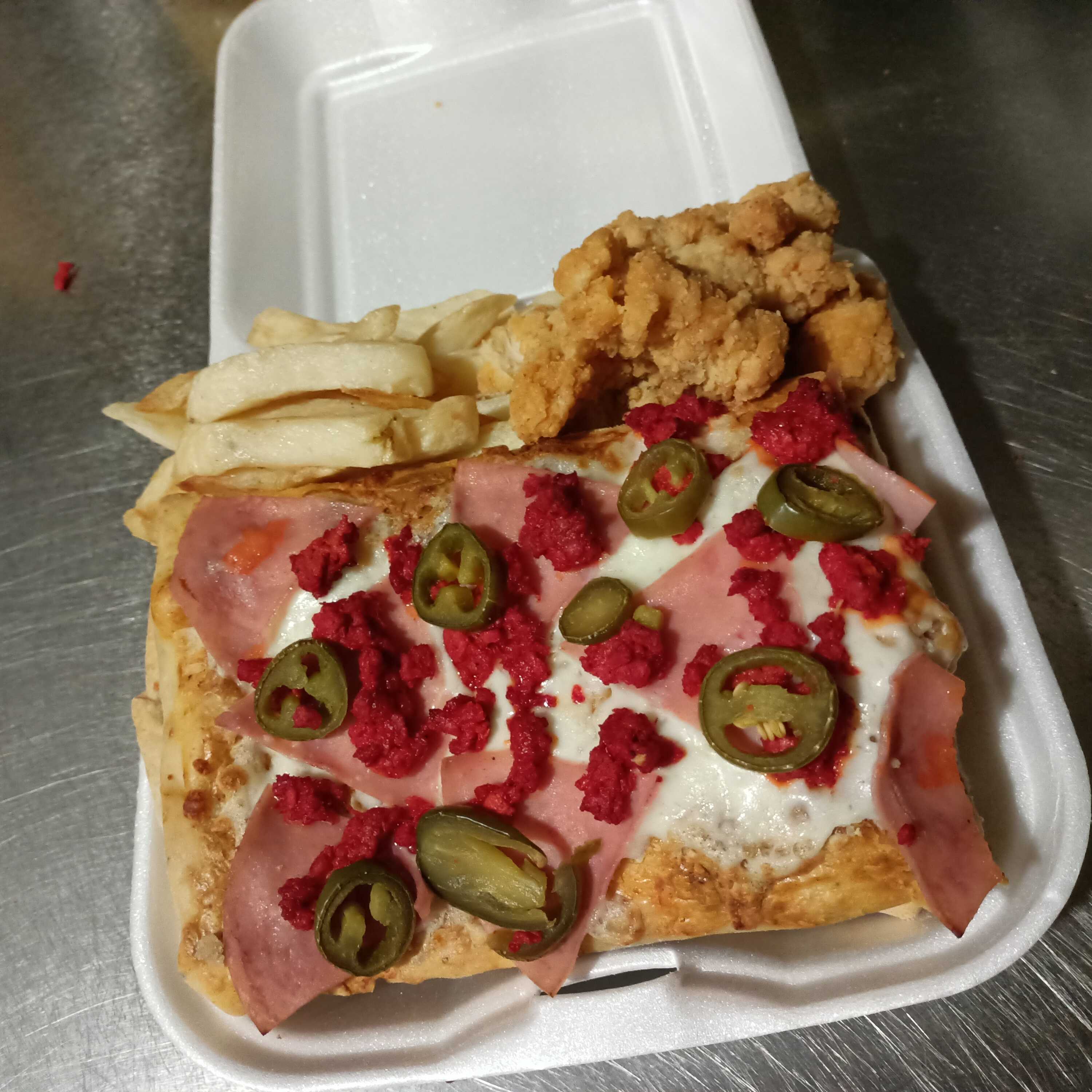 Queso mozzarella, jamón, tocino, salchicha italiana, peperoni acompada de papas fritas y aderezo chipotle.