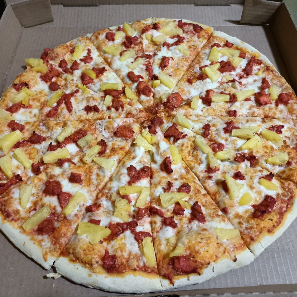 Salsa, queso mozzarella, jamon, tocino y piña de 12 rebanadas.