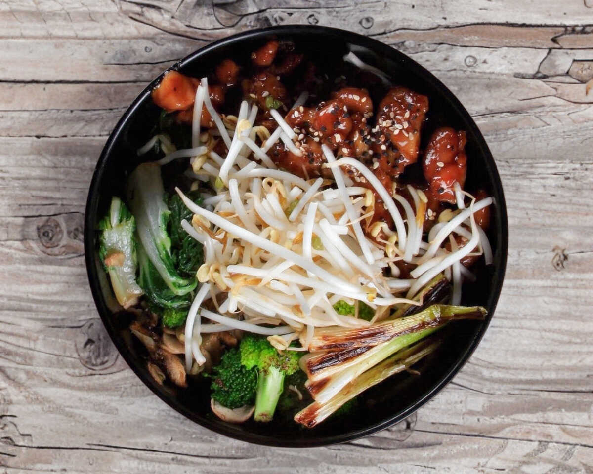 Fideos de arroz, espinaca, chop suey y champiñon salteado de salsa agridulce ligeramente picante con proteína.