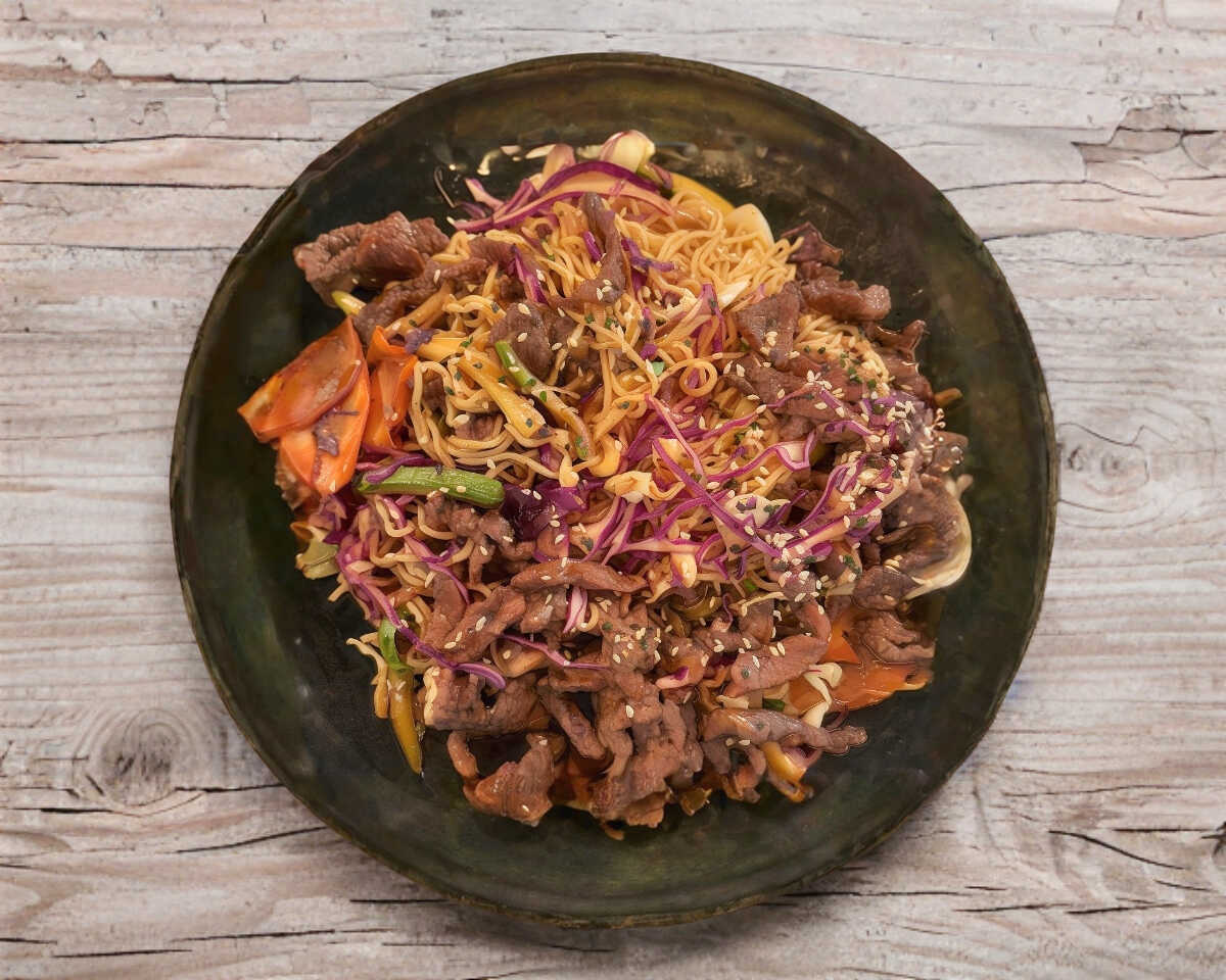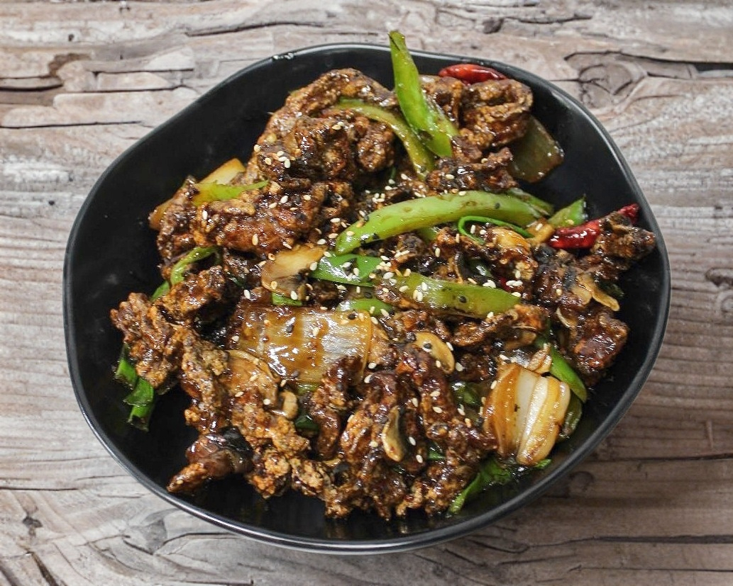Carne de res marinada, rebosada frita, chile de árbol, cebolla, chile morrón, champiñon y cebollín salkteado en salsa mongol servido en cama de fideo de arroz frito.