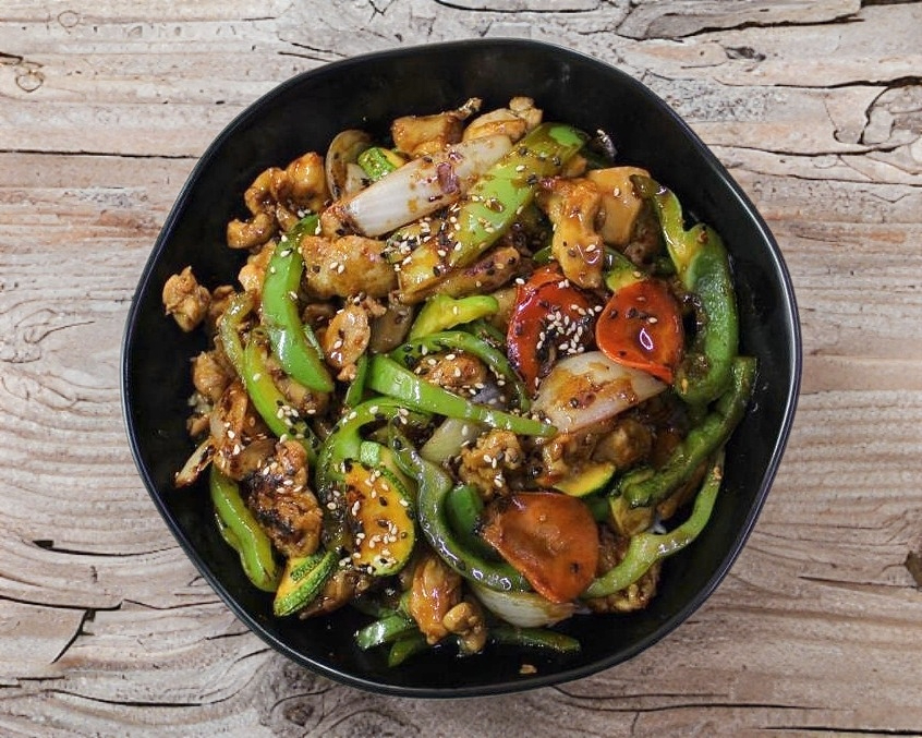 Pollo, zanahoria, calabaza, chile morrón, cebolla salteada con salsa teriyaki servido en ca,ma de arroz a vapor.