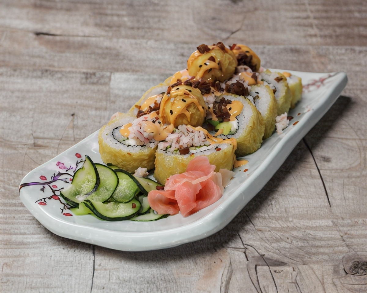 Rollo empanizado relleno de alga, queso crema, aguacate, queso monterrey, cubierto de tampico, tocino, con bolitas de queso crema empanizado.