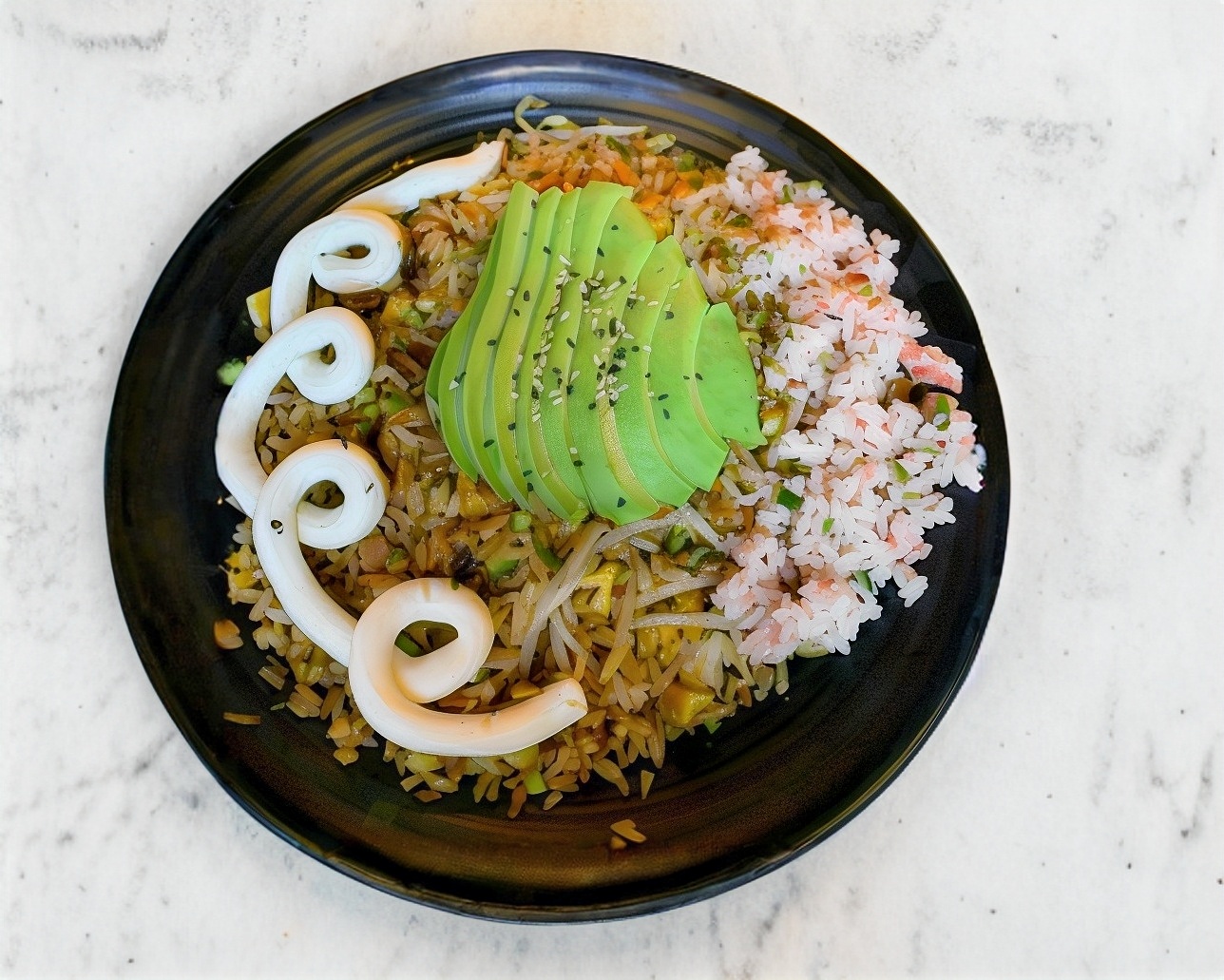 Arroz frito con pollo, calabacita, repollo, zanahoria, cebollín, brócoli, huevo, jengibre, ajo y chop suey.