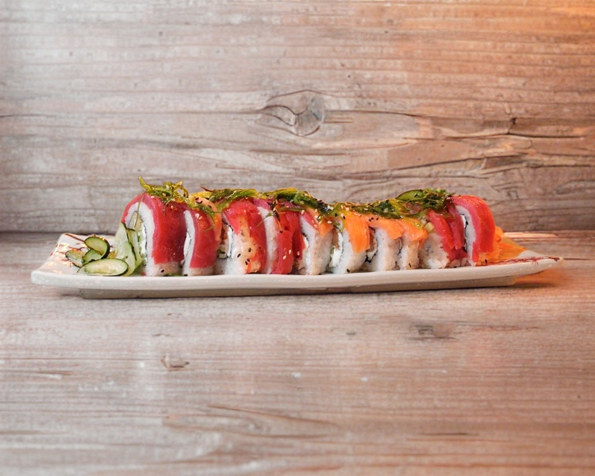 Rollo relleno de alga, queso crema, pepino, camarón capeado forrado de salmón e atún.