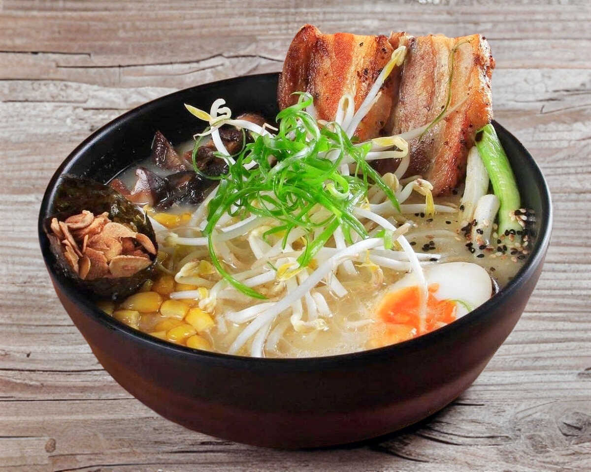 Caldo de cerdo, pasta ramen, pork belly, elote, shiitake, huevo cocido, ajo frito, aceite de ajo, chop suey y alga nori.