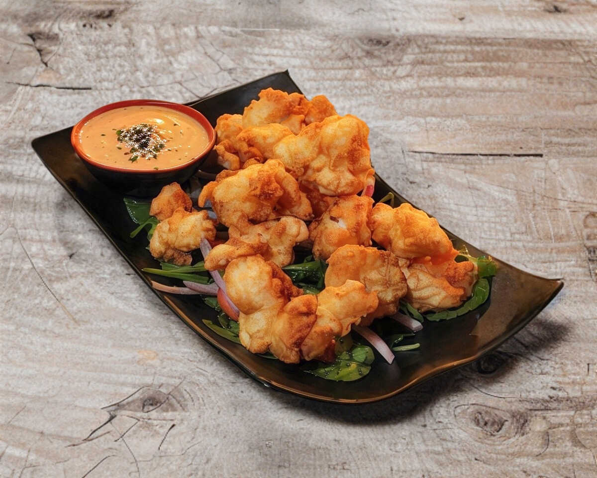 Bocados de coliflor en tempura fritos, bañados con salsa de búfalo, acompañados con aderezo de blue sheese.