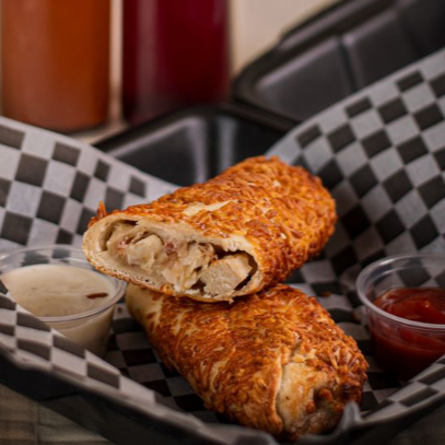 Rollo de pan horneado relleno de pollo, queso y aderezo, servido con papas fritas.