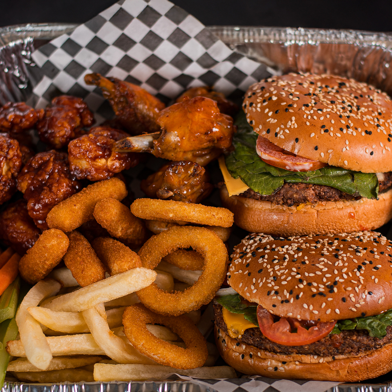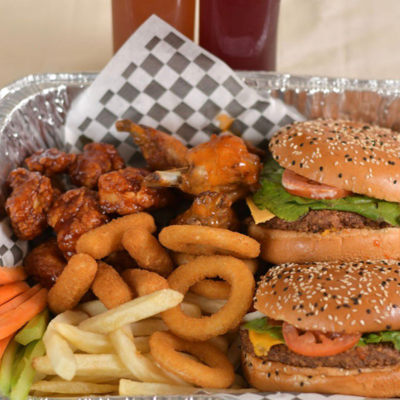 Deliciosa Charola que incluye 2 hamburguesas, 6 pzas de aros de cebolla, 3 pzs de dedos de queso,6 pzs de boneless con su deliciosa porcion de papas sazonadas