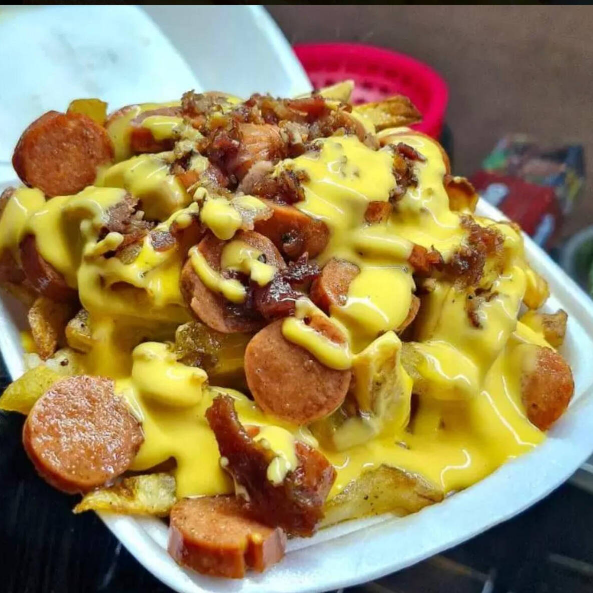 Trocitos de salchicha con papas a la francesa y delicioso tocino