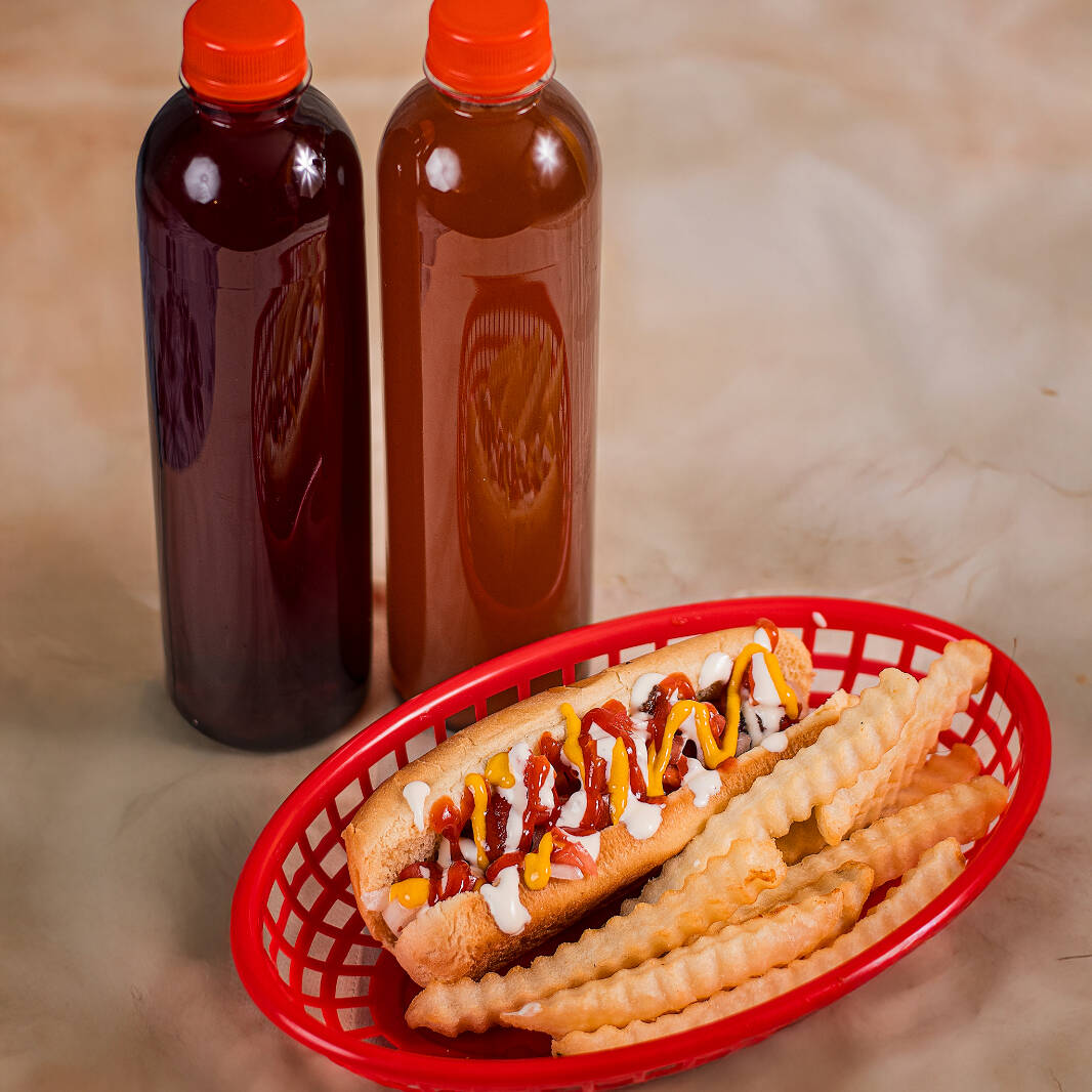 Hot dog premium con salchicha de un cuarto de libra, acompañado de papas fritas y té.