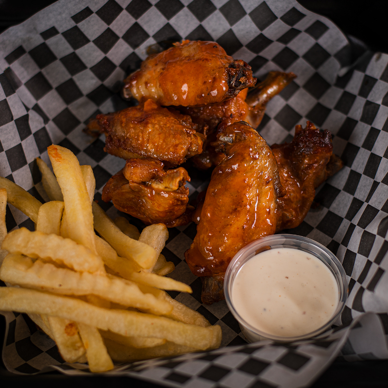 Alitas de pollo fritas y sazonadas, acompañadas de una guarnición de papas fritas.