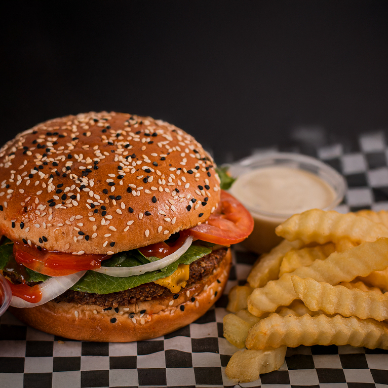 Hamburguesa clásica de carne de res a la parrilla, servida con papas fritas.
