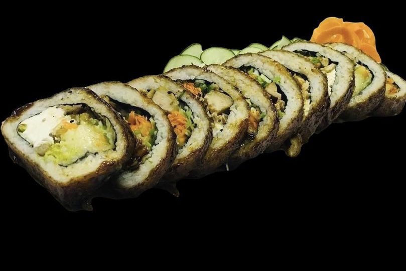 Dentro Philadelphia, queso monterrey, cebollín, zanahoria, pollo, tocino, empanizado y salteado en salsa teriyaki.