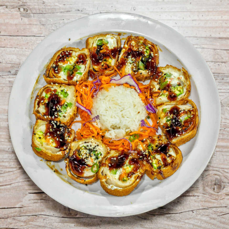 Arroz frito, verduras, Philadelphia, aguacate, camarón empanizado y tampico.
