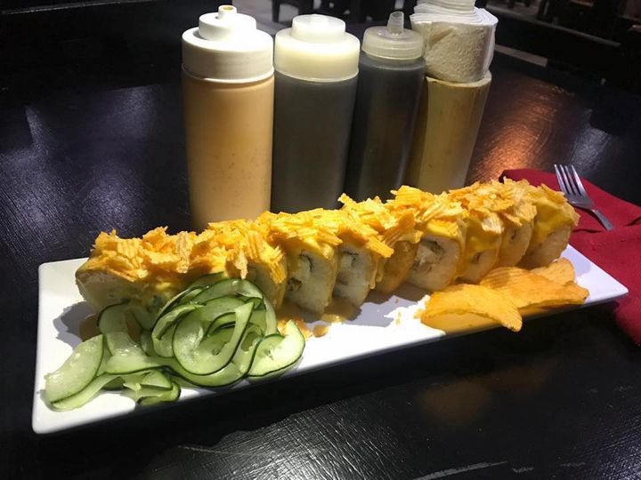 Pasta Dragon, camarón empanizado aguacate, chetos, forrado de Sabritas, salceado en salsa picosa.