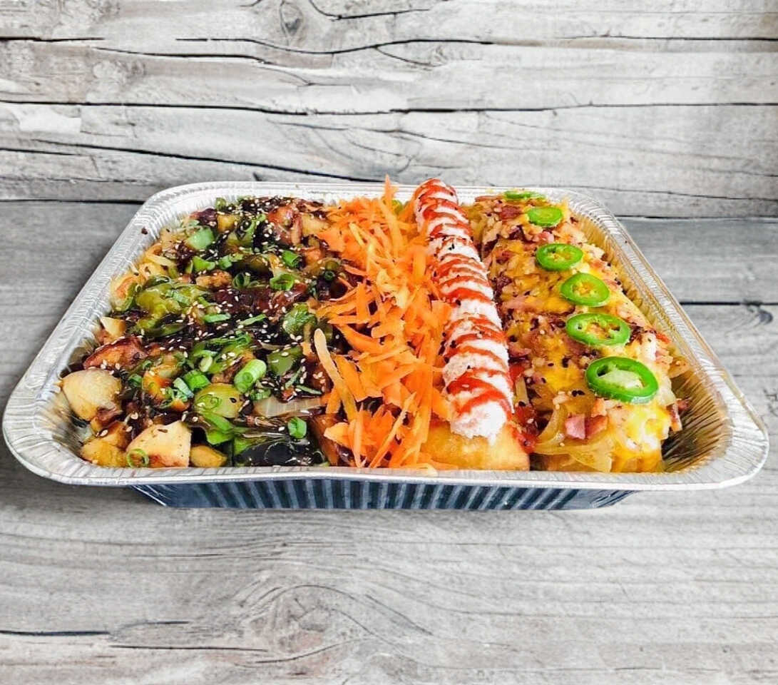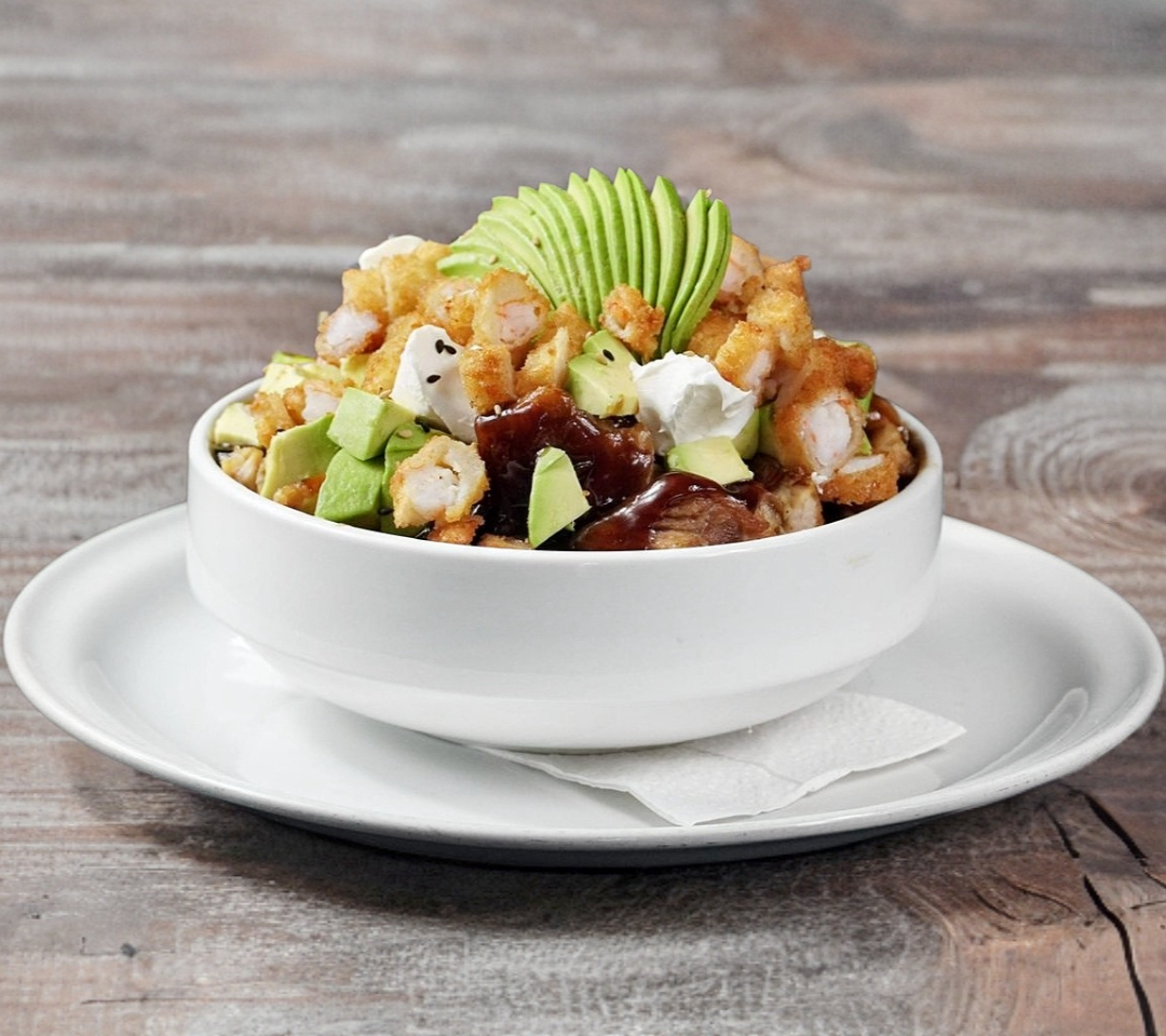 Tocino, aguacate y queso Philadelphia, topping de queso monterrey, cebollín, salsas, camarón empanizado, bolitas de queso Philadelphia empanizadas, aguacate, masago y siracha.