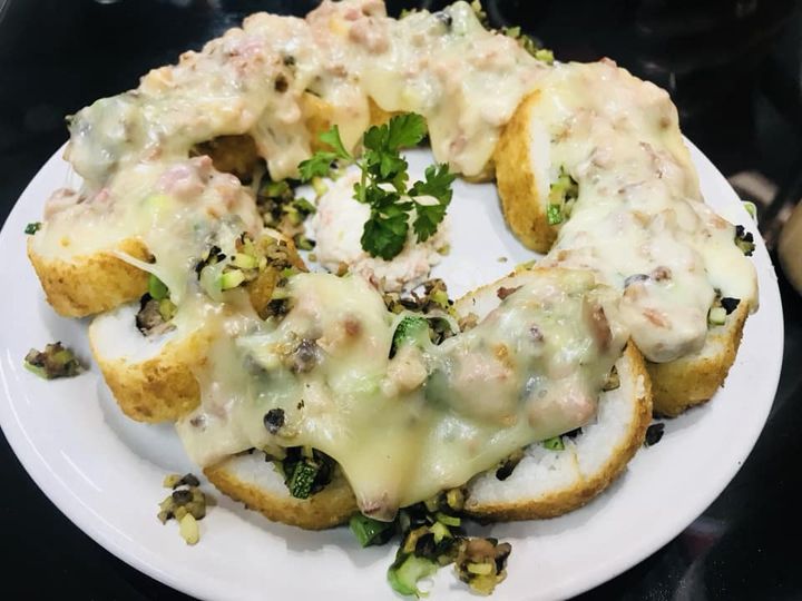 Tocino, aguacate, queso Philadelphia, rollo empanizado con topping de queso monterrey, cebollín, camarón, pulpo y salsas.