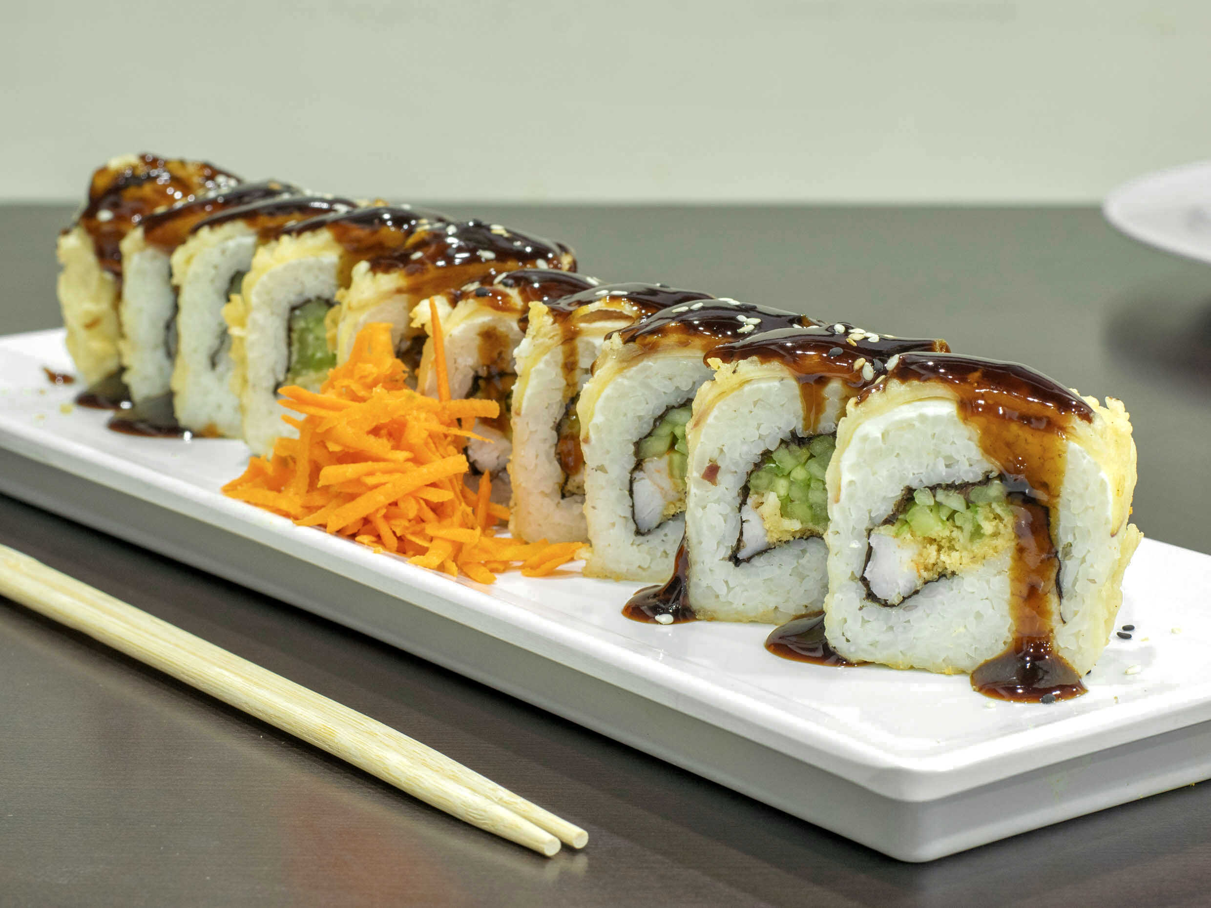 Pepino , aguacate, Philadelphia, ebi, Plátano Macho, salsa de anguila.