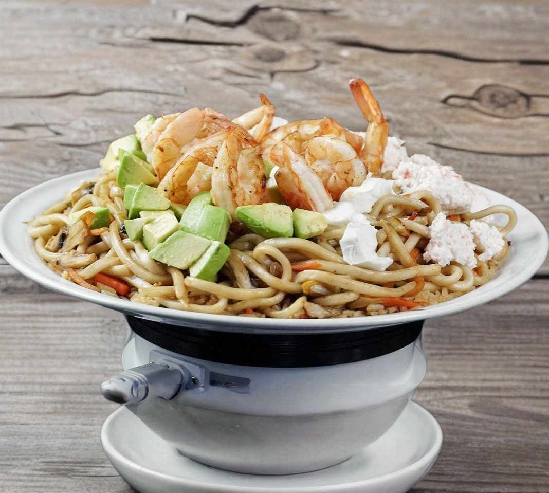 Calabaza, zanahoria, champiñon, espinaca, brócoli, cebollín, pasta noodle, camarón, pulpo, salmón y piel frita.
