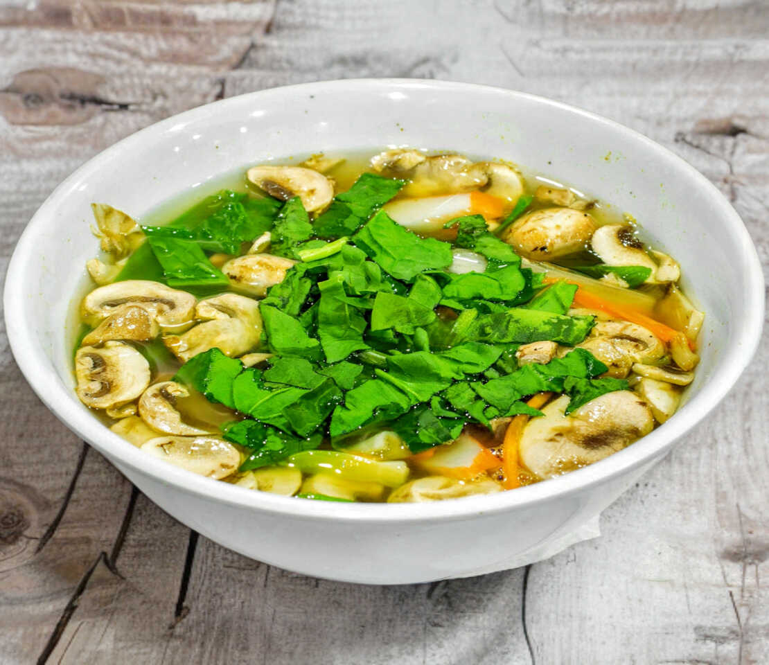 Pollo, calabaza, zanahoria, champiñón, espinaca, brócoli, queso fresco y pasta noodle.