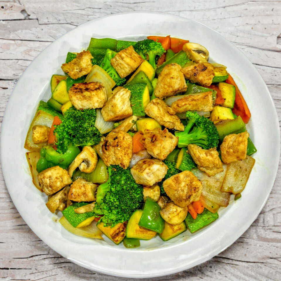 Verduras a la plancha, morrón, calabaza, cebolla, champiñon, brócoli, zanahoria, shop suey, pollo.