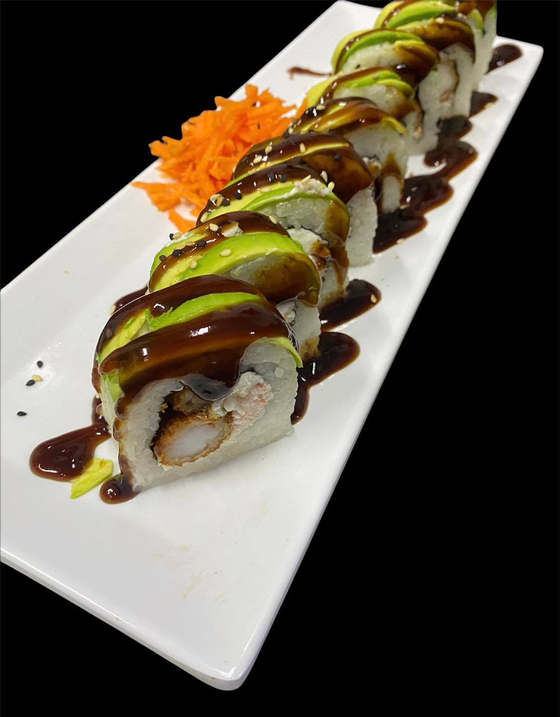 Philadelphia, carne, tempura, cebollín, forrado de aguacate, toping especial.