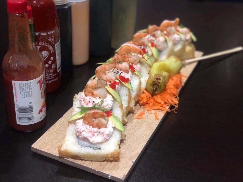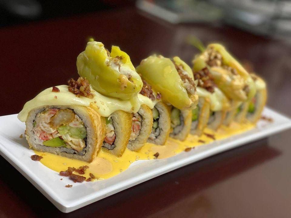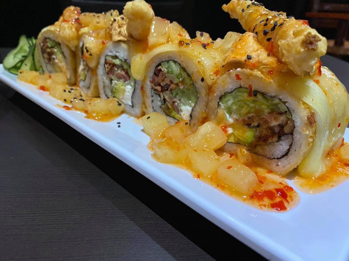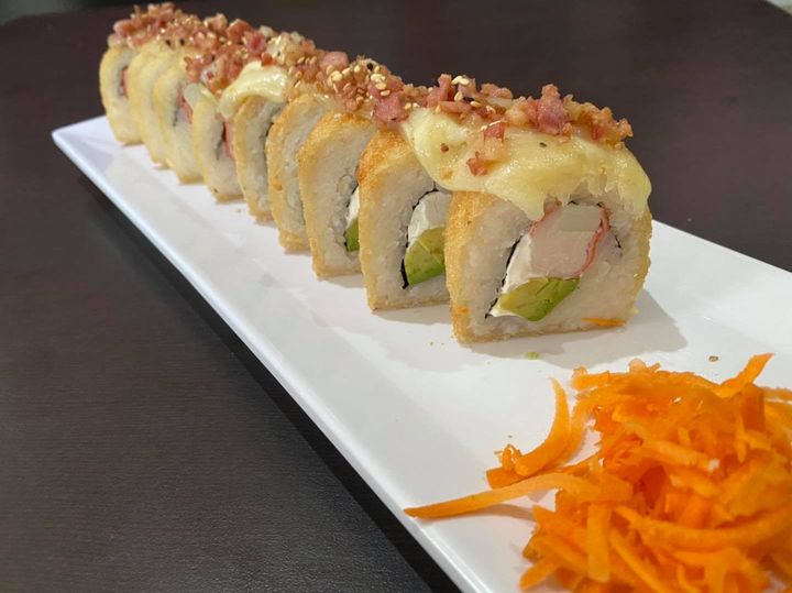Tocino, aguacate, queso Philadelphia, rollo empanizado con topping de queso monterrey, cebollín, camarón, pulpo y salsas.