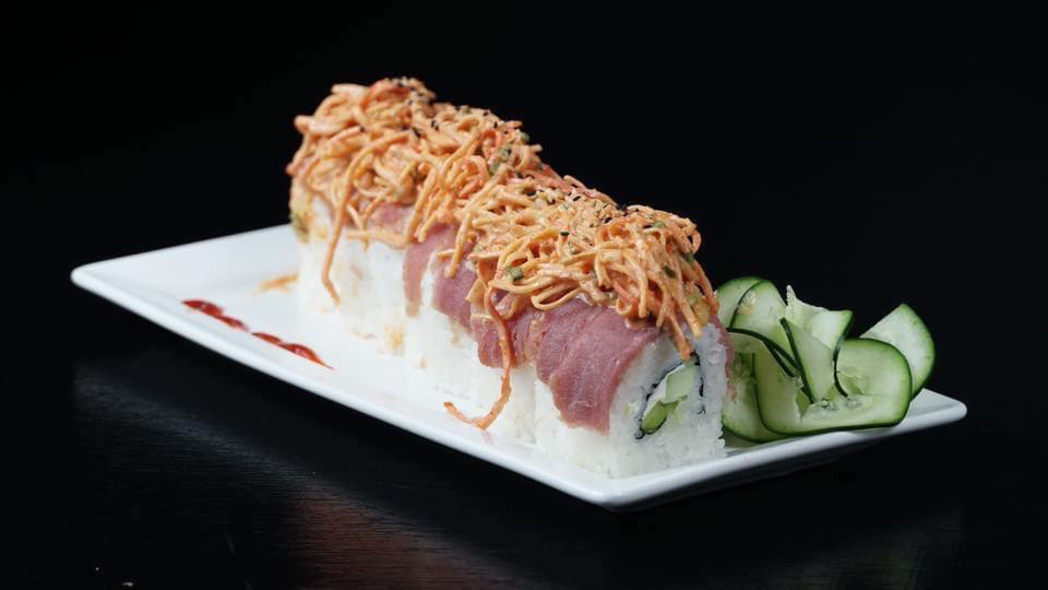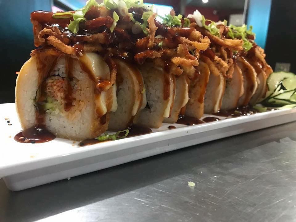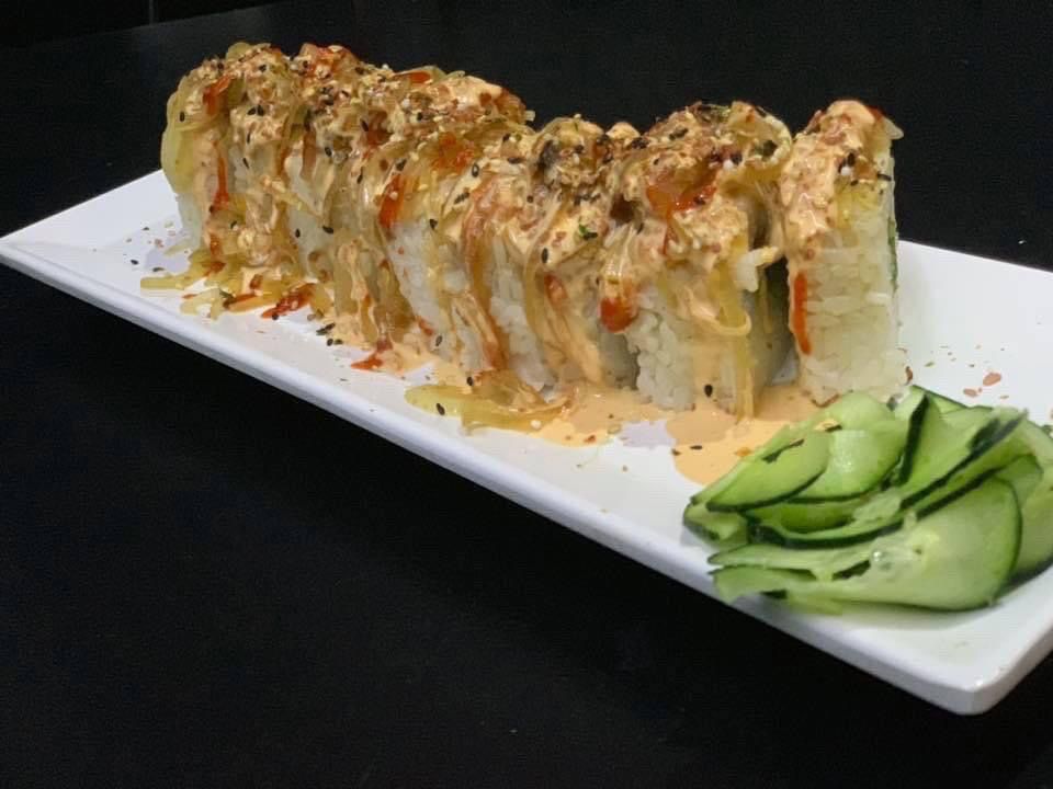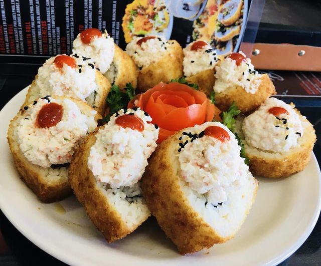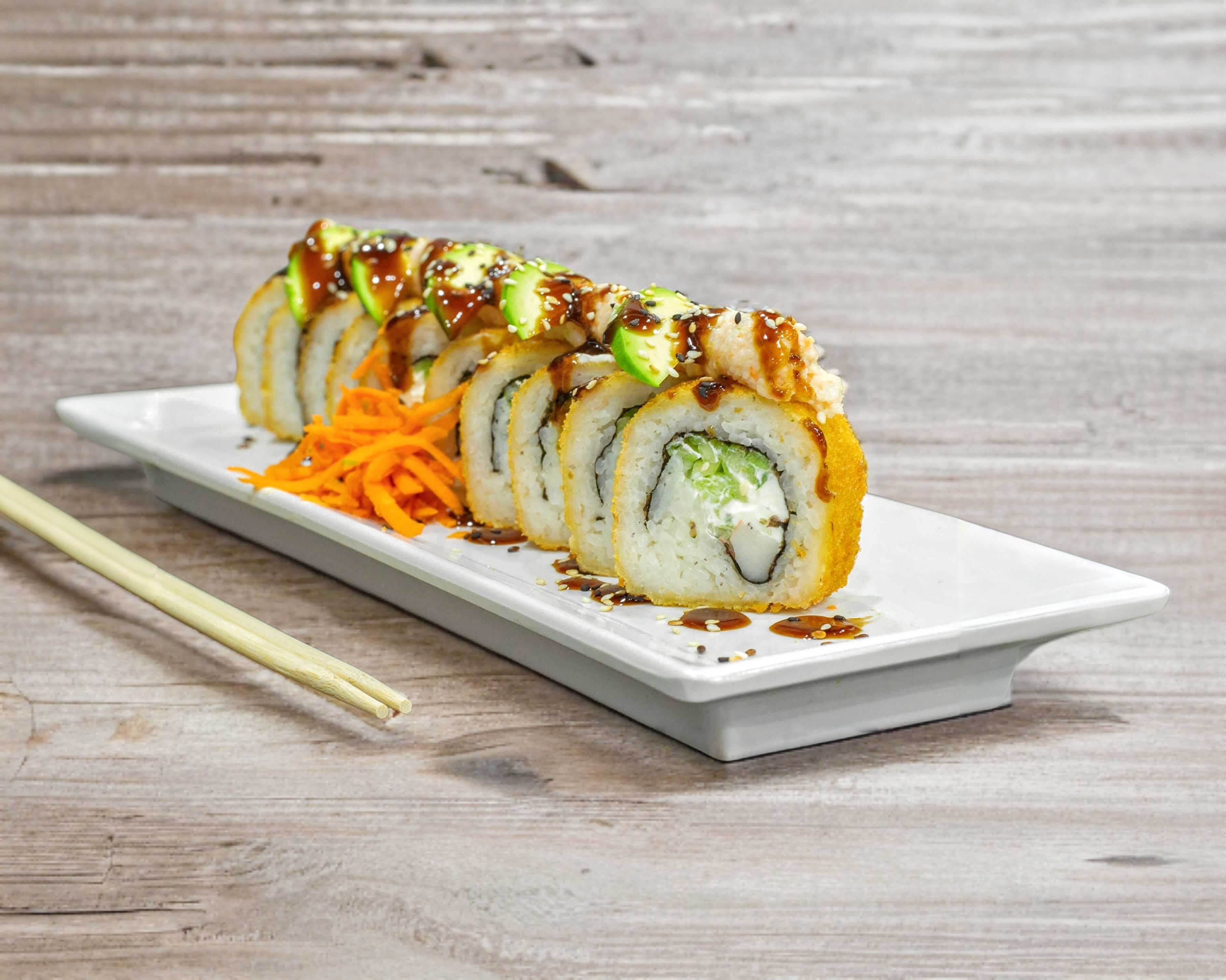 Tocino, aguacate, queso Philadelphia, rollo empanizado con topping de queso monterrey, cebollín, camarón, pulpo y salsas.